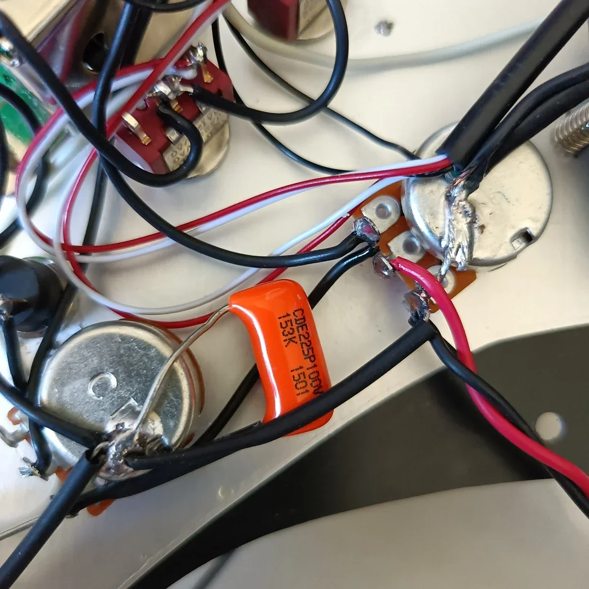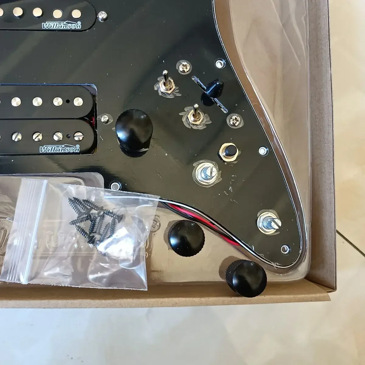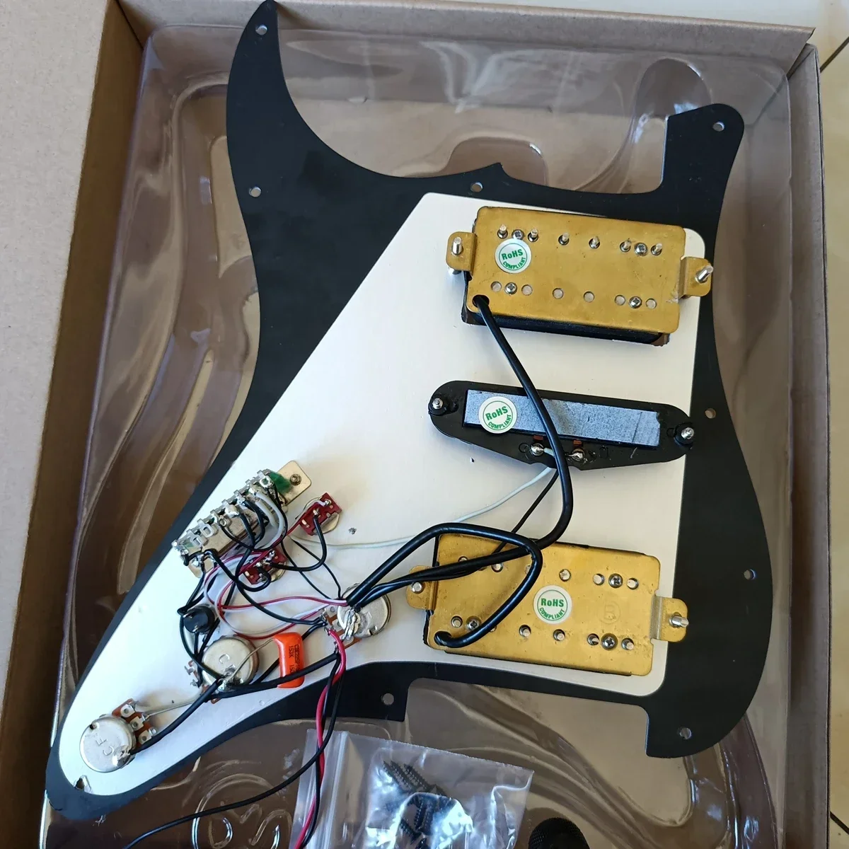Experience versatile and high-quality sound with this prewired electric guitar pickguard set designed for standard U.S./Mexican Fender or Squier Stratocaster models. Crafted from durable 3-ply material measuring 285x220x60mm and weighing 700g, it features two ceramic humbuckers with resistances of 7.56kΩ and 14.5kΩ, and a single-coil pickup with 5.12kΩ. The set includes three potentiometers, a 5-way switch, an enhanced switch, two toggle switches, mounting screws, and an output jack, all preinstalled for easy setup. Its glossy finish and customizable color options make it a perfect upgrade to enhance your guitar’s aesthetic and tone.