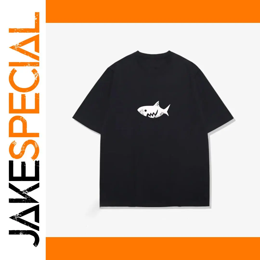 - This unisex black T-shirt features a vibrant white cartoon shark graphic, outlined in black, creating a playful yet stylish focal point perfect for any casual outfit.