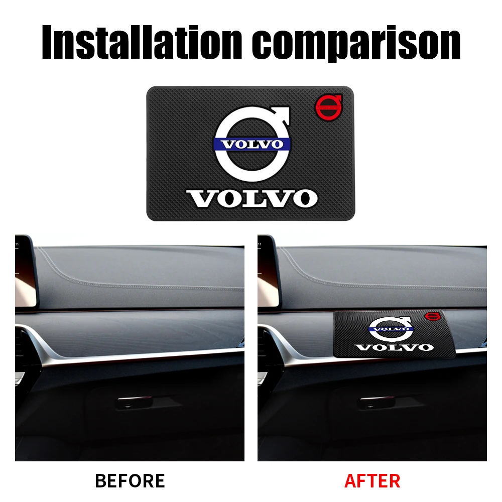 Enhance your driving experience with this soft silicone non-slip dashboard mat designed to securely hold smartphones, coins, and keys without adhesive or magnets. Measuring to fit a range of vehicle models including R Design, XC90, S60, XC60, V70, S80, S40, V50, V40, V60, V70, V90, C30, C40, C50, C70, S70, S90, XC30, XC40, XC70, the textured surface with small raised bumps prevents items from sliding or falling, ensuring organization and safety during every drive. Its sleek black design complements modern interiors, combining functionality with style.