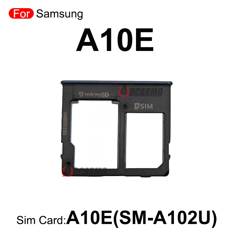 Replace your lost or damaged SIM card tray with this original, high-quality black tray designed specifically for the Samsung Galaxy A10E (model SM-A102U). Crafted for durability and precise fit, it features a sleek matte finish that seamlessly matches your device's aesthetic. The tray’s dual-slot configuration allows you to insert both the MicroSD card and Nano SIM card easily, ensuring you maintain optimal functionality. Its slim, lightweight design includes subtle engravings and markings, such as the model number “V120330” and a small triangular symbol to confirm compatibility. The gold-colored metallic contact ensures a secure connection within your phone, providing peace of mind that your storage and network functionalities are maintained without fuss. An excellent replacement part for restoring your device’s full capabilities.
