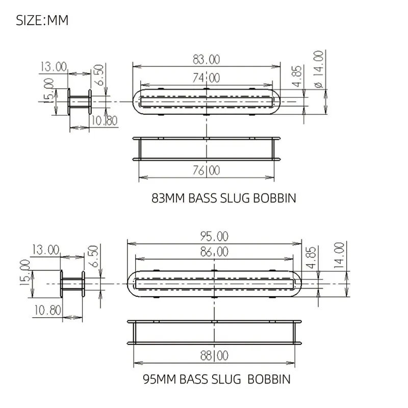 Experience the perfect replacement for your electric guitar or bass pickup with these high-quality slug bobbins. Crafted from durable ABS plastic, they feature a smooth, minimalist design with gently curved, elongated rectangular shapes. Available in two sizes—83 x 14 x 13 mm and 95 x 14 x 13 mm—these black bobbins provide a seamless aesthetic match to your instrument’s existing components. Their central slot allows for easy coil wire fitting, ensuring efficient installation and reliable performance. The matte black finish offers a professional look, blending perfectly with various guitar and bass styles while maintaining a clean, unobtrusive appearance. Whether you’re repairing or customizing, these replacement bobbins deliver both style and functionality.