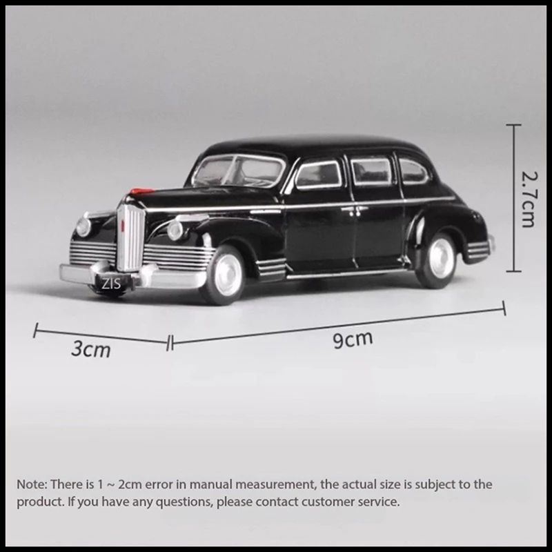 Experience the nostalgic charm of this detailed diecast alloy model of the Soviet ZIS-110 Sedan. Measuring approximately 9 cm in length, 3 cm in width, and 2.7 cm in height, this 1:64 scale replica showcases the vintage elegance of the iconic Soviet automobile. The glossy black finish, complemented by subtle chrome accents on the window frames, door handles, and bumper, highlights the smooth, rounded contours and streamlined silhouette of the original design. The vertical grille with chrome bars and large, rounded headlights evoke a timeless class that collectors and enthusiasts will appreciate. This model is perfect for display on desks, shelves, or in collections, offering a refined homage to classic automotive engineering.