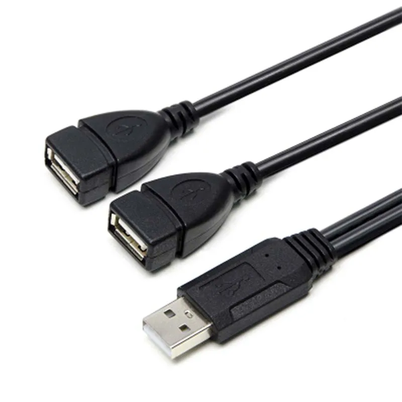 - Features a male USB A connector with metallic interior and two female USB A ports housed in matching black plastic casings.