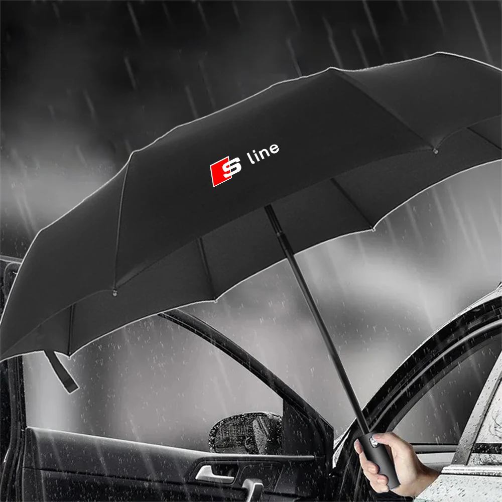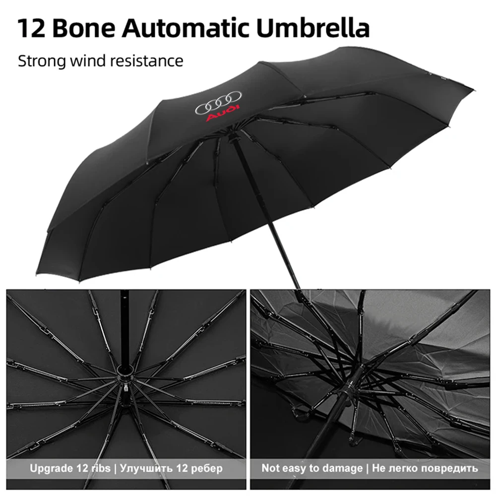 Experience reliable vehicle protection with this sleek black sunshade umbrella featuring a 35-inch (88.9 cm) diameter pongee fabric canopy that is waterproof and windproof. Its lightweight aluminum alloy frame ensures durability and ease of handling, while the dome-shaped design allows it to be self-standing. Equipped with a manual push mechanism for effortless opening and closing, this modern umbrella is compatible with various vehicle models including A3, A4, A5, A6, A7, A8, Q2, Q3, Q5, Q7, TT, TTS, and RS. The matte-finish canopy displays a prominent silver logo of four interlinked rings and bold red lettering, combining style and practicality for your vehicle’s exterior protection.