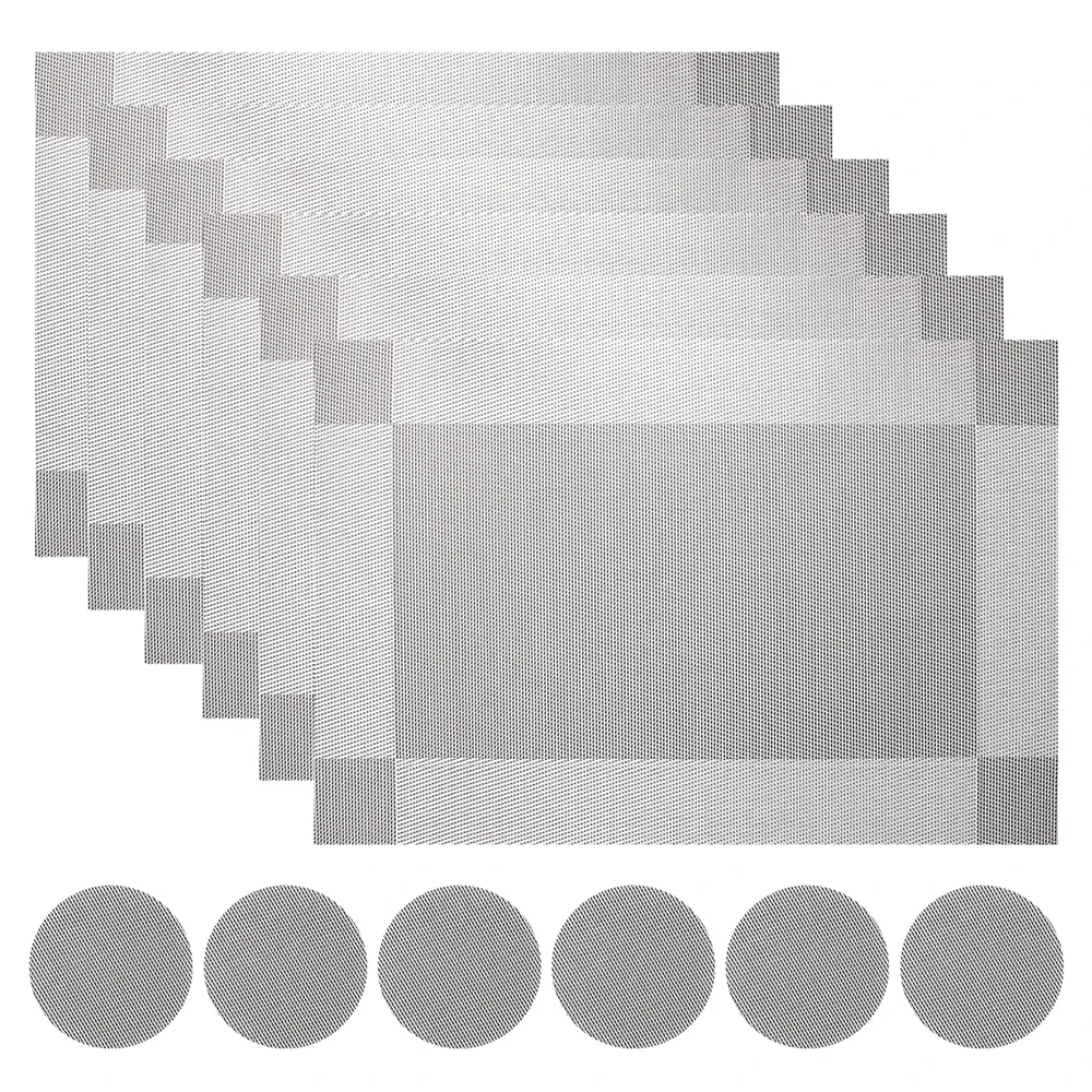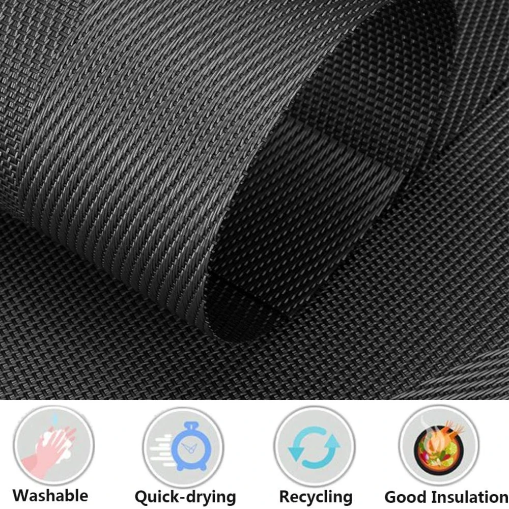 Imagine elevating your dining experience with this sleek set of six black placemats and matching coasters. Crafted from woven PVC vinyl, each piece features a textured crossweave pattern that adds depth and sophistication. The durable surface resists stains and heat, withstanding temperatures up to 176°F (80°C), making it perfect for hot plates and mugs. Thanks to the non-slip backing, your table remains protected and secure during meals. Easy to clean by wiping or machine washing, these placemats combine functionality with modern aesthetics. Their neutral black color complements any table setting, whether casual or formal. Experience the balance of style and practicality, transforming everyday dining into a stylish occasion.