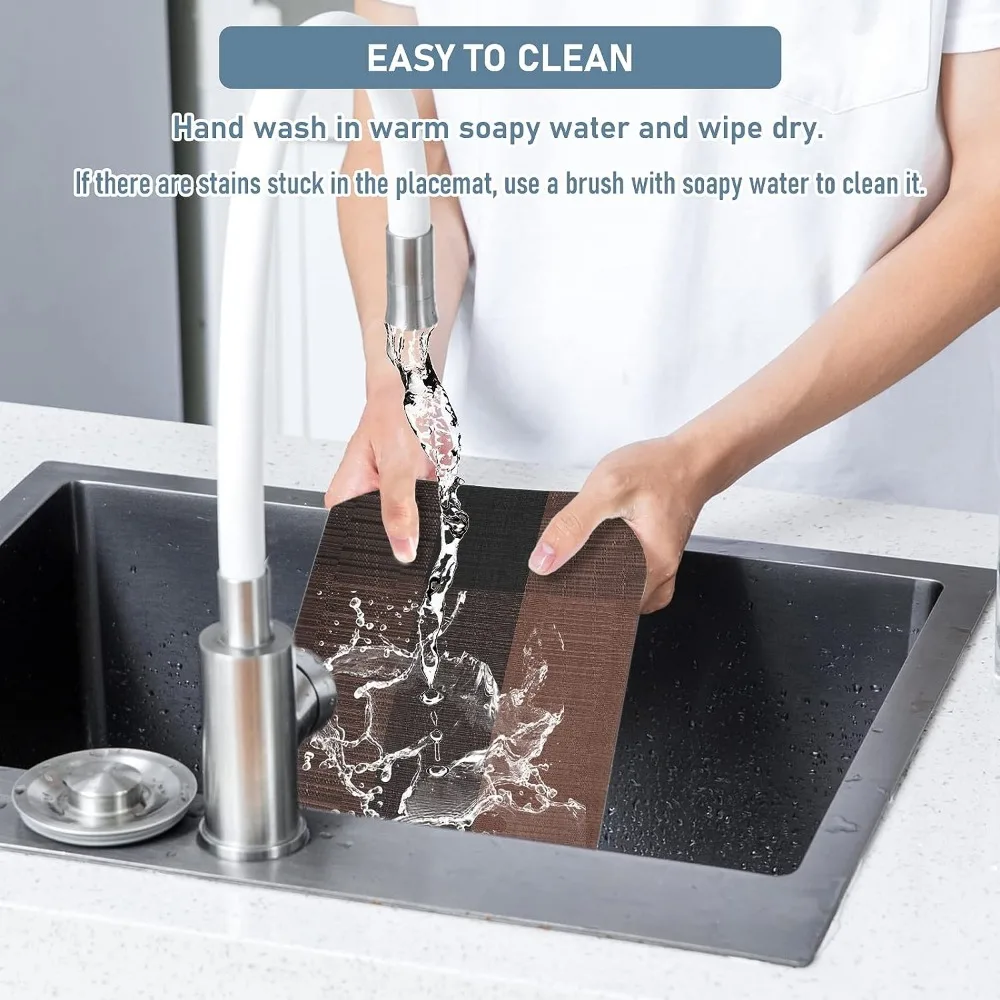 - Each placemat measures 12 x 18″ (30 x 45 cm), providing ample coverage to protect your table surface effectively.
