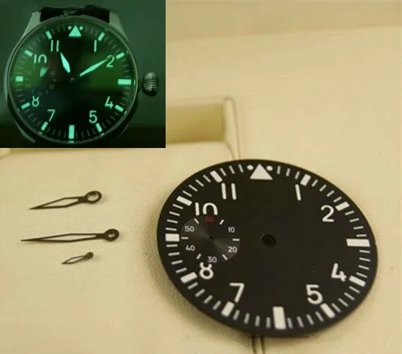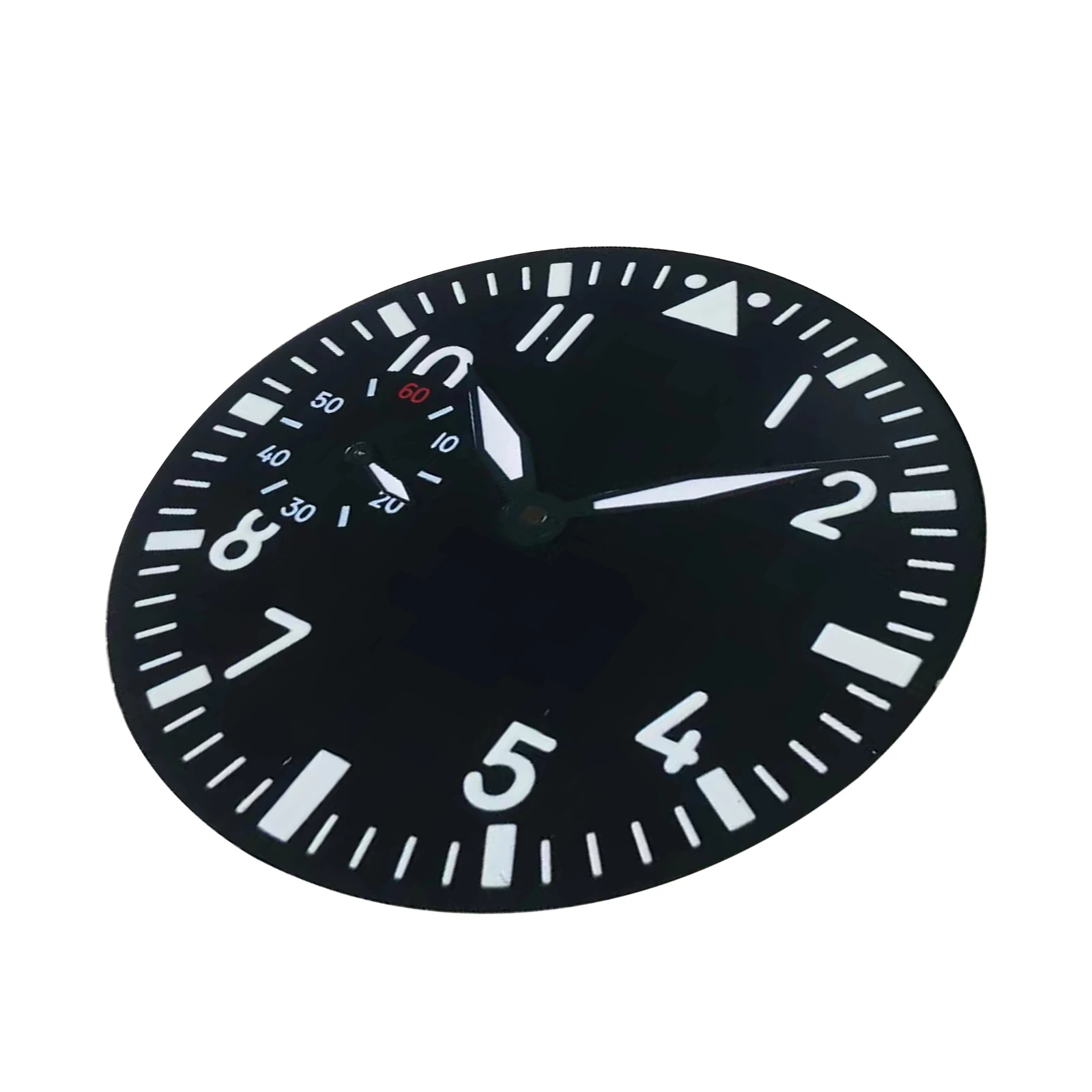 Upgrade your timepiece with this elegant black watch dial designed for ETA 6497 and Seagull ST3600 movements. Measuring 38.9mm in diameter and 0.38mm in thickness, the dial features white scale markings and green luminous numerals that glow in low light for easy readability. The hour hand measures approximately 5mm, the minute hand 11.8mm, and the second hand extends to 16mm, ensuring precise timekeeping. This set includes one high-quality watch dial and one complete set of watch hands, providing a stylish and functional enhancement to your watch collection.