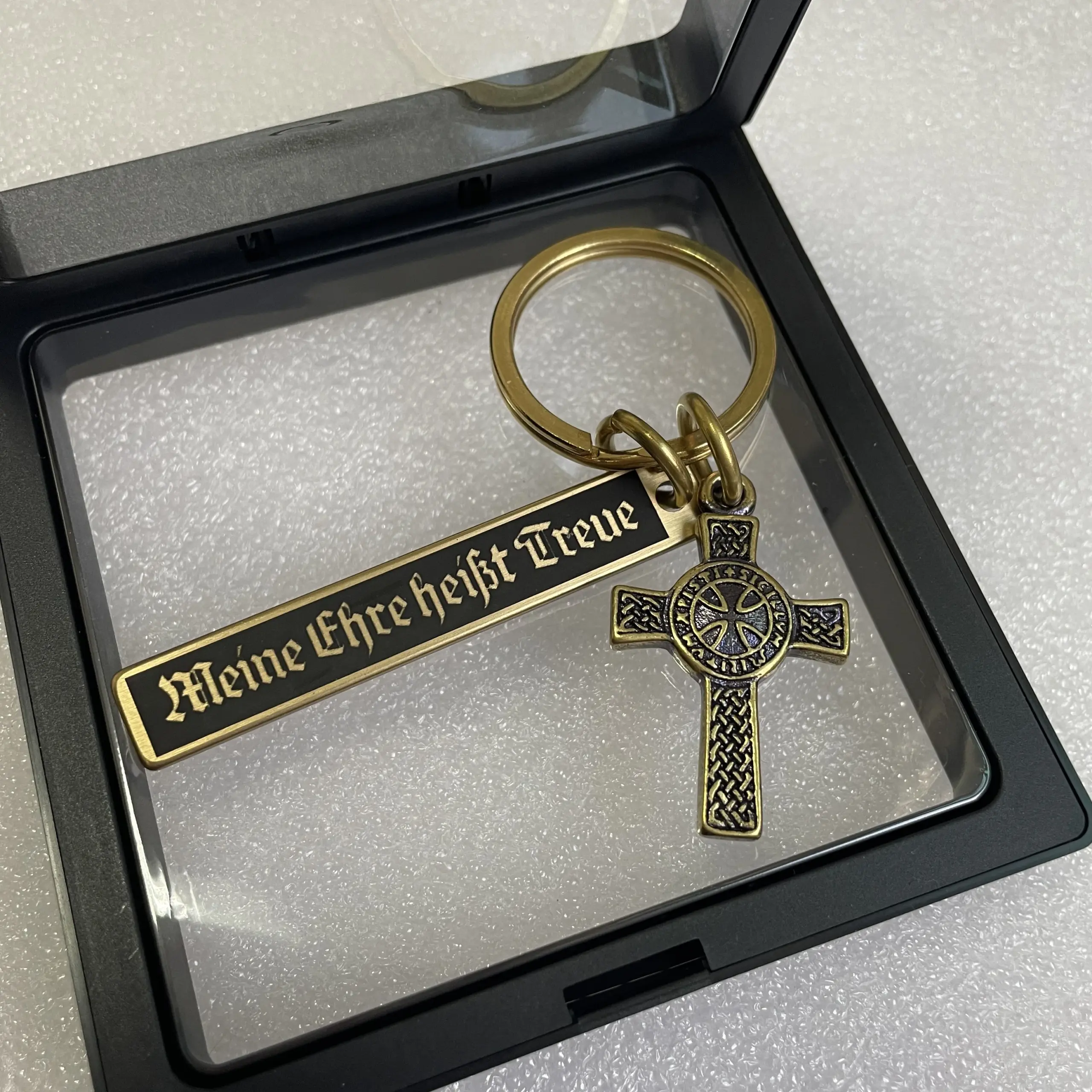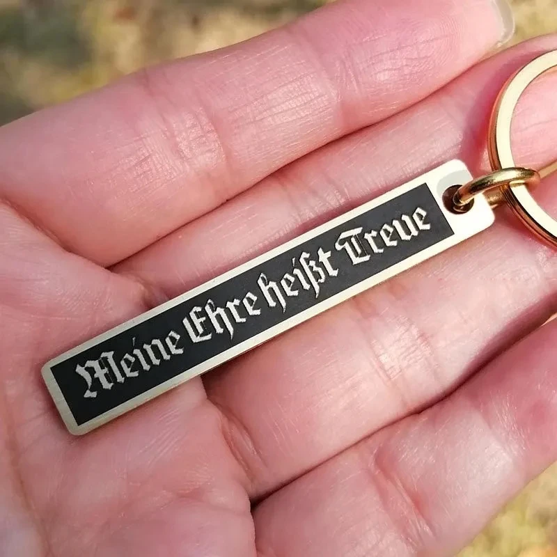 Experience the timeless appeal of this striking keyring, perfect for making a statement every day. Crafted with a glossy, smooth metal pendant, it features a captivating black and white gothic inscription, “Meine Ehre heißt Treue,” in bold, medieval-style lettering. The rounded edges enhance its polished look, while the large, shiny metallic O-shaped buckle ensures a secure and easy attachment to your keys or bag. Measuring approximately 8 cm in length, this unisex piece combines cultural symbolism with sleek design. Whether you're adding to your collection or gifting someone special, this keyring embodies strength, loyalty, and style that lasts. Its high-quality copper material guarantees durability and a refined finish.