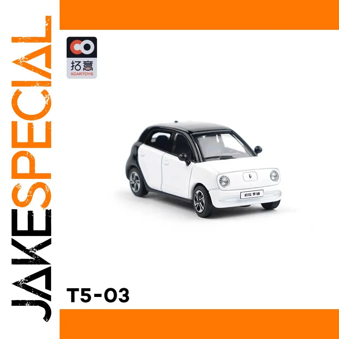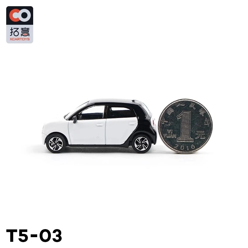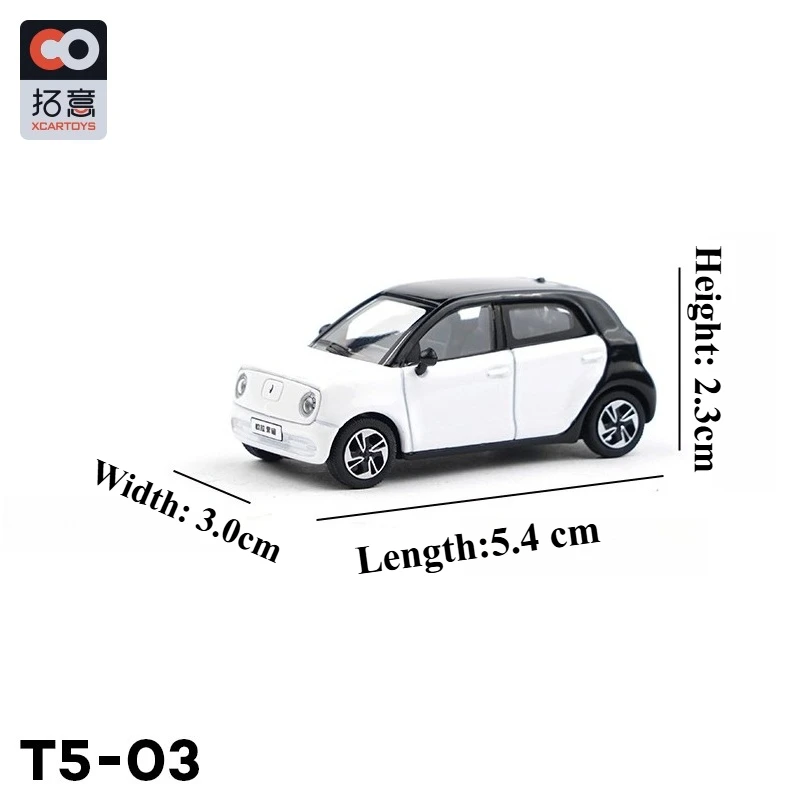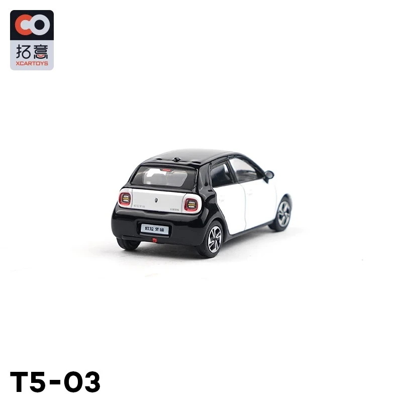 Step into a world of playful elegance with this this 1:64 scale diecast alloy car. Its sleek, rounded design, featuring a striking combination of white and bold black accents, captures the eye instantly. The roof, side mirrors, and window frames are painted black, creating a high-contrast look that mimics a playful black cat. The smooth, integrated front with embedded round headlights and a minimalist grille enhances its modern aesthetic. With a compact, slightly curved roofline, this model combines whimsy and realism perfectly. The clear windows outlined in black reveal a minimal interior. Small black wheels with silver patterns further complete its charming, collectible appeal. This piece is ideal for enthusiasts or as a unique gift.
