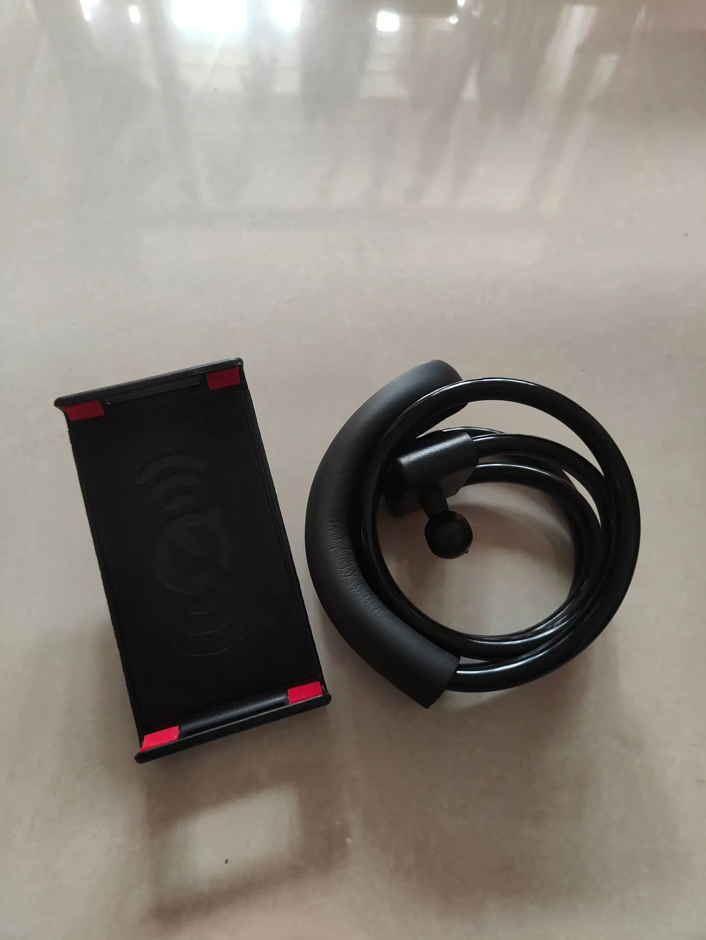 Experience effortless charging and hands-free device management with this sleek black wireless charging holder. Crafted with a minimalist design, it combines functionality with modern aesthetics, making it a perfect addition to your workspace, car, or home. The rectangular charging pad features rounded edges, embossed with a wireless charging symbol, and accented by subtle red highlights on opposite corners, adding a touch of contrast. Its flexible, gooseneck-like arms are coated in black rubber, allowing you to adjust the device to any angle easily. This versatile holder offers stable support, preventing shaking, and enables convenient viewing of your phone, media, or navigation. Compact and lightweight, it's designed for seamless integration into your daily routine, ensuring your device is always within reach and powered up.