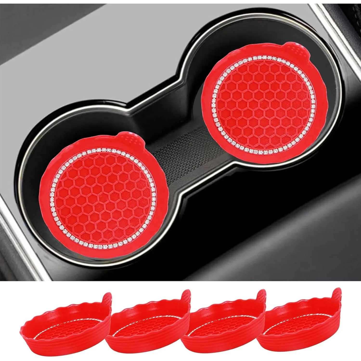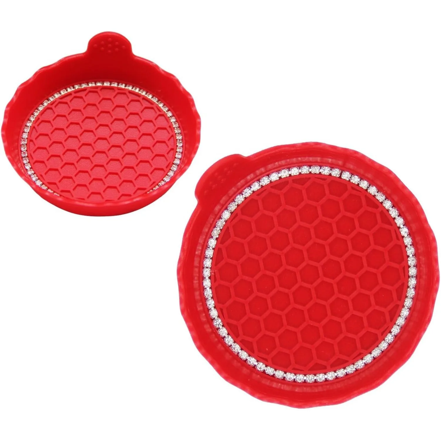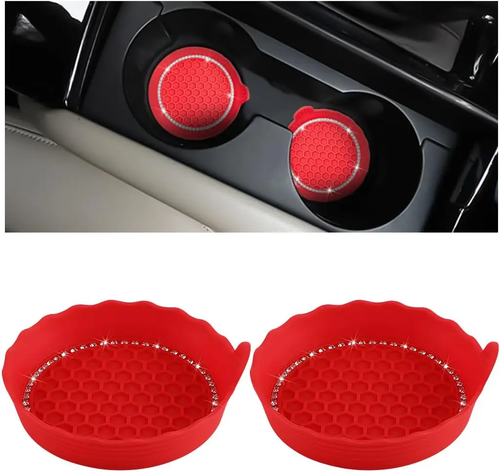 Enhance your driving experience with this set of stylish Bling Car Cup Coasters that effortlessly combine functionality and flair. Made from high-quality, flexible silicone, these coasters feature a striking red hue and a decorative scalloped edge. With a deep cup shape designed to trap spills, they keep your vehicle clean while preventing scratching in cup holders. The textured honeycomb surface guarantees grip, ensuring your drinks remain secure even during bumpy rides. Easy to clean, simply rinse them under water. Picture yourself cruising with these dazzling coasters, transforming your car’s interior into a chic and tidy space.