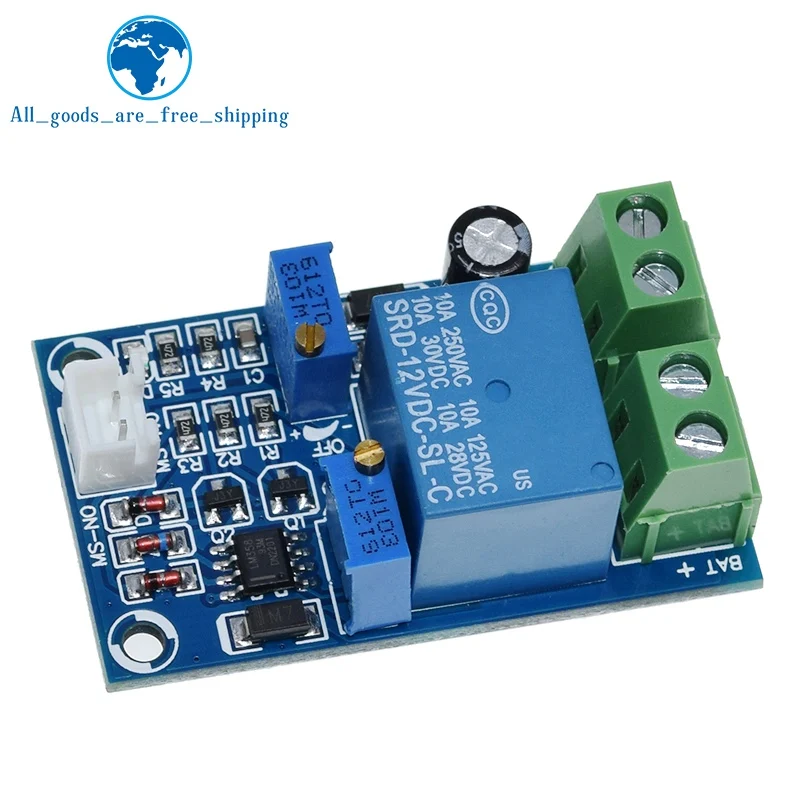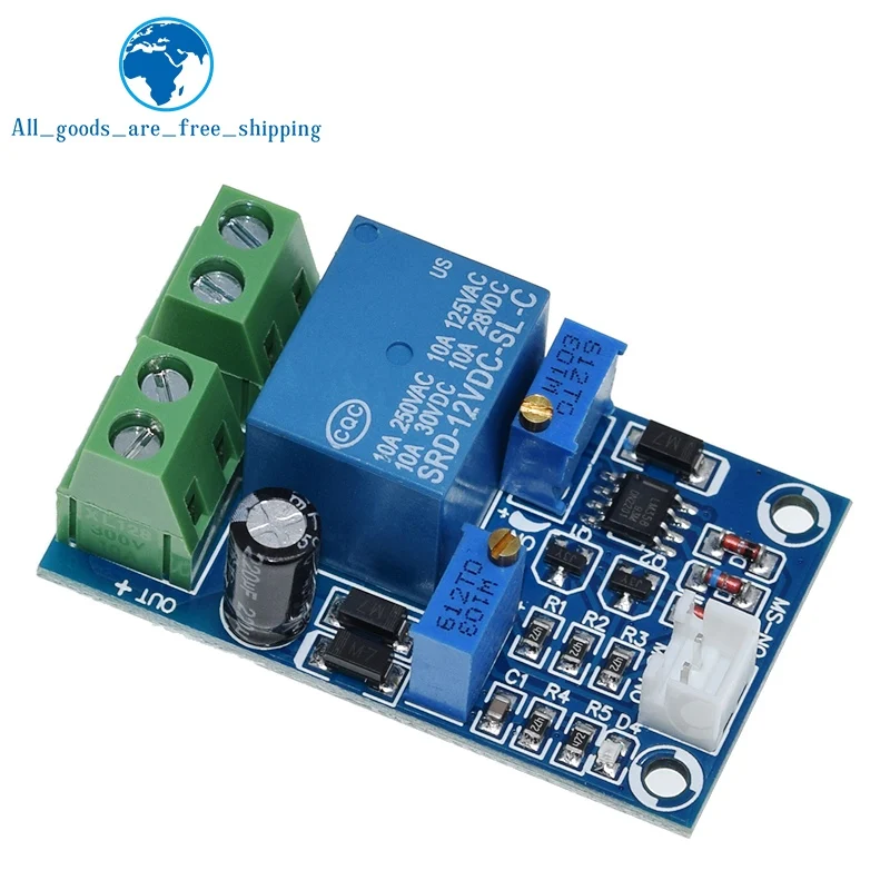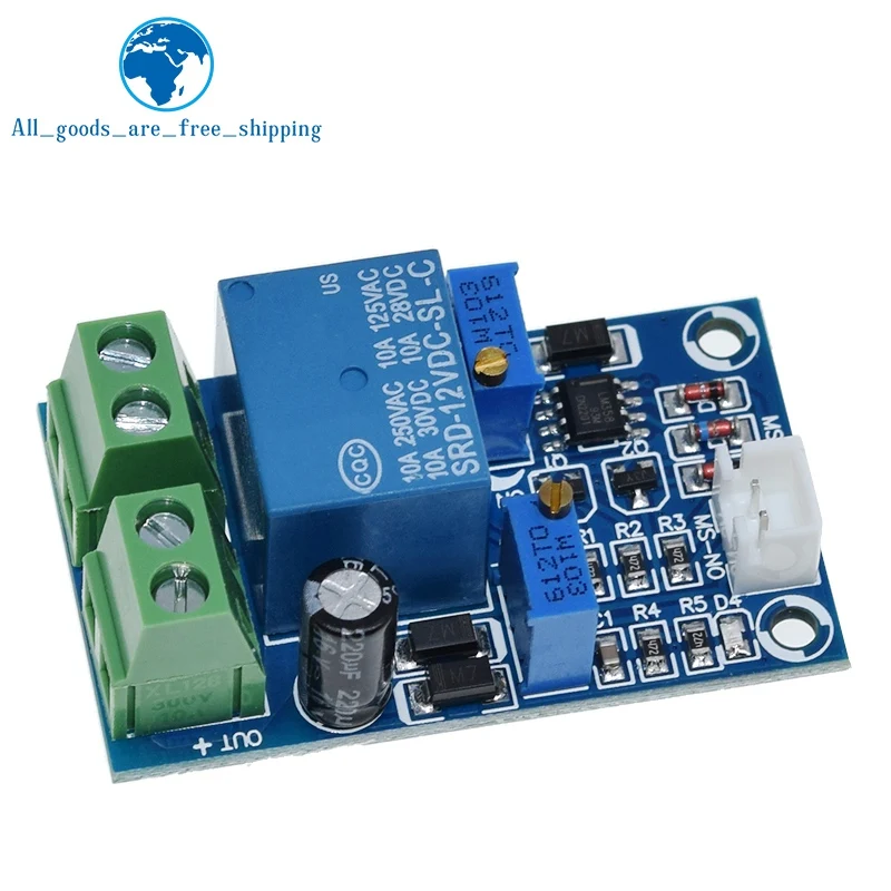 Experience reliable power management with this innovative Charging Controller Switch Module, designed to ensure your battery system operates safely and efficiently. Featuring a vibrant blue surface, the compact rectangular design combines industrial aesthetics with practical functionality. Precise surface-mounted components and a prominent blue relay highlight its technical sophistication, while the large black potentiometer provides easy manual calibration. Neatly organized green screw terminal blocks, labeled clearly for power input and output connections, make installation straightforward. Built in a surface-mounted device (SMD) package, this module is perfect for applications requiring automatic low-voltage cut-off and recovery. Its user-friendly design makes it an indispensable tool for safeguarding your battery systems in various electronic setups.