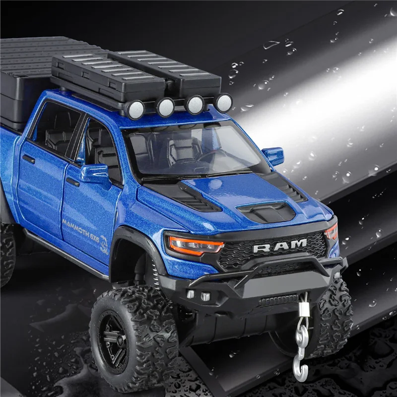 Imagine adding this stunning 1:32 scale diecast model to your collection, showcasing a vibrant blue finish with a glossy metallic sheen that captures attention instantly. This realistic replica features a rugged off-road design, perfect for showcasing adventure and craftsmanship. The detailed front grille bears the prominent “RAM” logo, complemented by articulated headlights and a reinforced bumper with a black grille. Large, textured off-road tires mounted on black rims highlight its tough aesthetic. The streamlined side mirrors match the body color, while the transparent windows reveal a simplified, proportionate interior. The roof is fitted with a black cargo rack featuring multiple compartments, enhancing its adventure-ready style. Ideal for display, this model radiates authenticity and rugged charm.