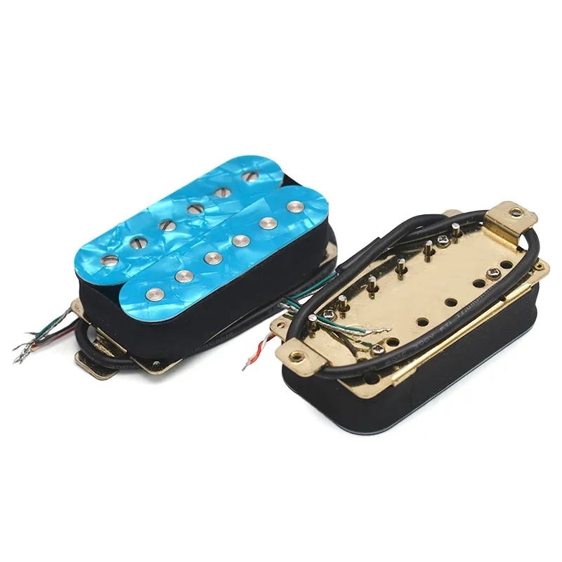 Experience a bold new tone with this set of blue electric guitar humbuckers. Perfect for customizing your 6-string guitar, these pickups combine vibrant color and technical precision. Featuring textured blue plastic bobbins, they add visual flair to your instrument. The dual-coil design includes six metallic pole-pieces arranged in two rows, with adjustable screws and fixed slugs for fine-tuning your sound. With a resistance of 7.5kΩ for the neck and 15kΩ for the bridge pickups, they deliver balanced, powerful output. Built with ceramic bar magnets and four-coil cables (340mm and 300mm long), these pickups ensure clarity and sustain. Choose from multiple colors such as green pearl, white pearl, red pearl, blue pearl, and yellow pearl to match your playing style and aesthetic. An excellent upgrade for guitar enthusiasts seeking both style and functionality.