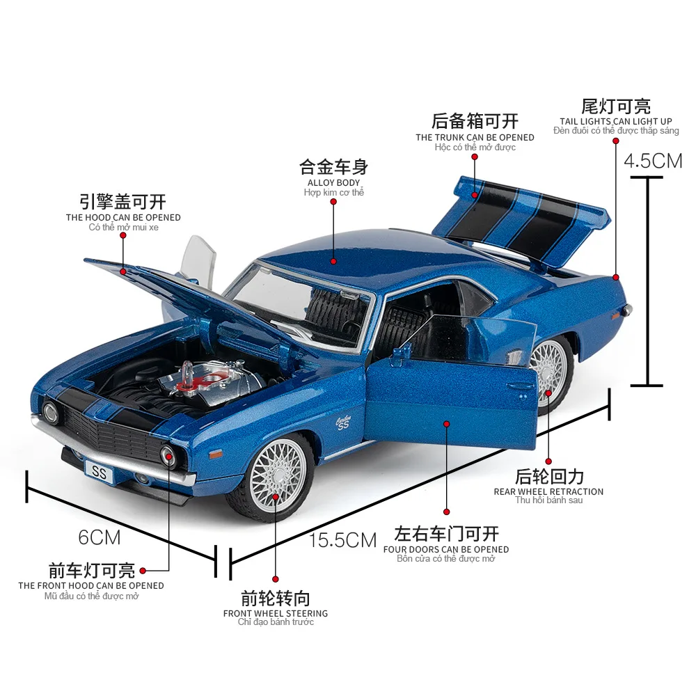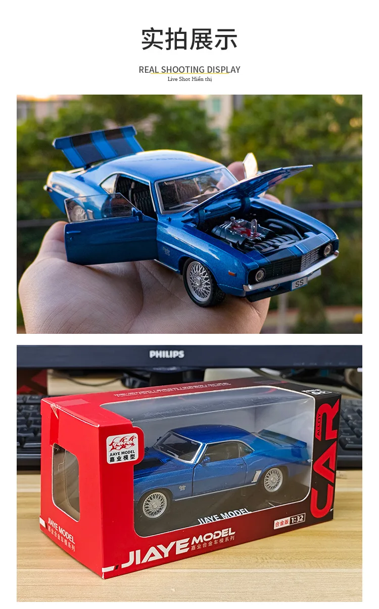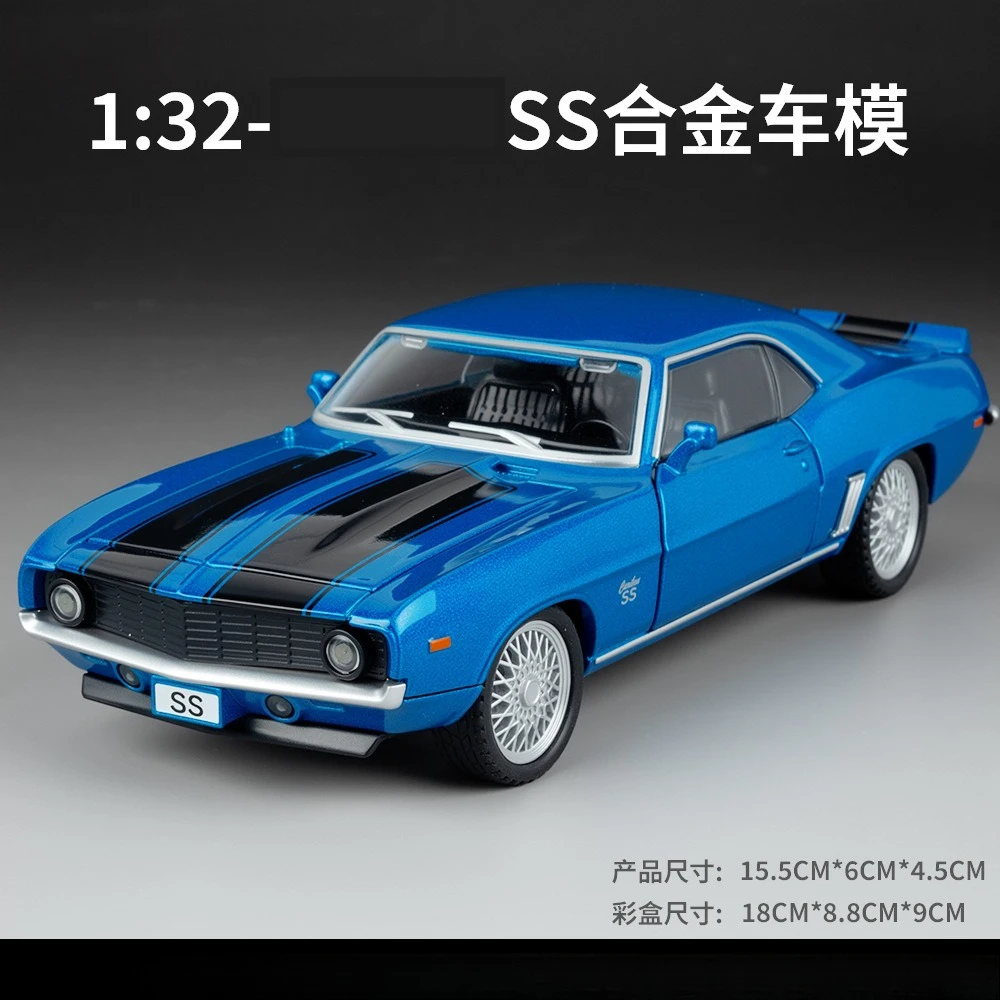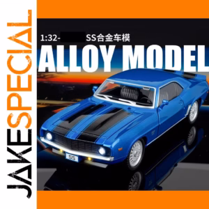 - 1:32 scale alloy model featuring vivid blue paint and black racing stripes for a vibrant visual impact.