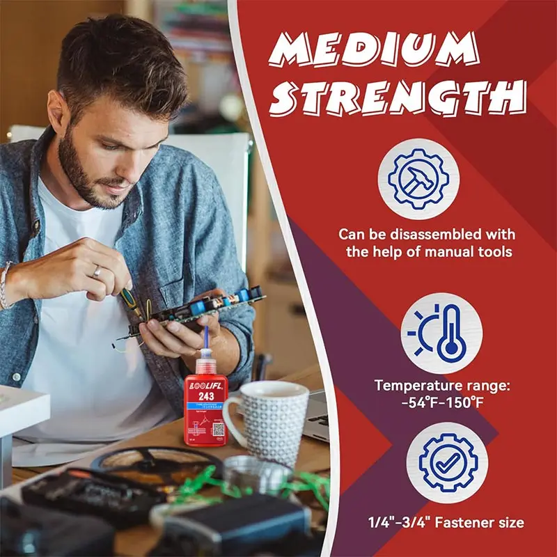 - It provides medium strength bonding, allowing for easy disassembly when needed without damaging components.