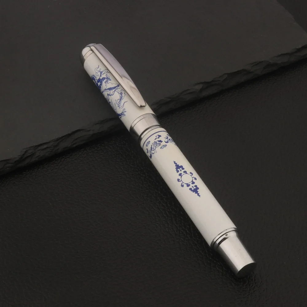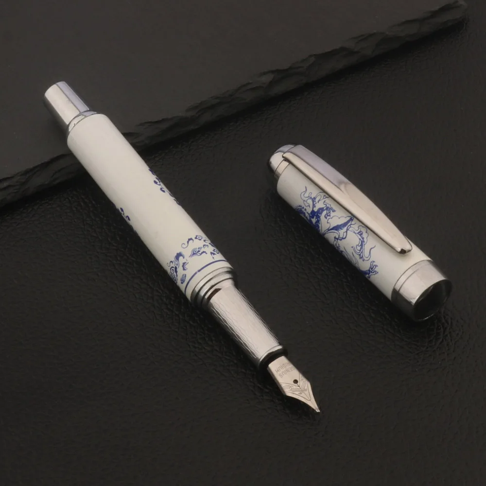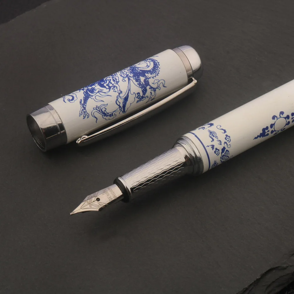 Immerse yourself in the artistry of fine writing with this exquisite blue and white fountain pen, crafted with a striking design inspired by traditional motifs. The slender white body is adorned with intricate blue patterns, reminiscent of mythical dragons or oriental artwork, creating a captivating aesthetic. Its silver-colored, engraved nib exudes craftsmanship and precision, while the textured metallic grip offers comfort and control during use. Weighing just 35 grams, this pen combines elegance with practical functionality, making it ideal for daily writing or as a sophisticated gift. The customizable design allows you to personalize your writing experience, elevating your stationery collection with a touch of cultural charm and premium quality.