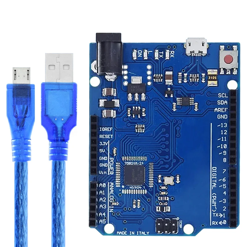 Experience seamless Arduino development with the Leonardo R3 Microcontroller Board, featuring a vibrant blue rectangular circuit board measuring 68.6 mm by 53.3 mm and weighing around 20 grams. Equipped with a powerful ATmega32u4 microcontroller running at 16 MHz and 5V operating voltage, it offers 20 digital I/O pins, 7 PWM channels, and 12 analog inputs. The board supports an input voltage of 7-12V (limits 6-20V) and features 32 KB flash memory, 2.5 KB SRAM, and 1 KB EEPROM. Its sleek design is complemented by a transparent, braided blue USB cable, connecting via micro-USB port, making it perfect for DIY Arduino projects and creative prototyping.