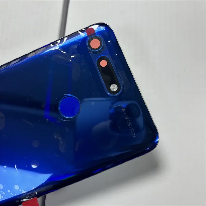 This vibrant blue battery cover is specifically designed for the Honor View 20, also known as the Huawei Honor V20. Featuring a glossy finish that reflects light beautifully, it delivers a sleek, aesthetically pleasing look. The design incorporates precise cutouts for two camera lenses located at the top left corner, with a circular indentation placed below for the fingerprint sensor, ensuring functionality while maintaining an elegant style. Minor surface imperfections may be present, but they do not detract from its overall appeal. With branding that reads “AI VISION,” this cover highlights its high-tech capabilities. It is the ultimate solution for those needing to replace their device's rear case without sacrificing style.