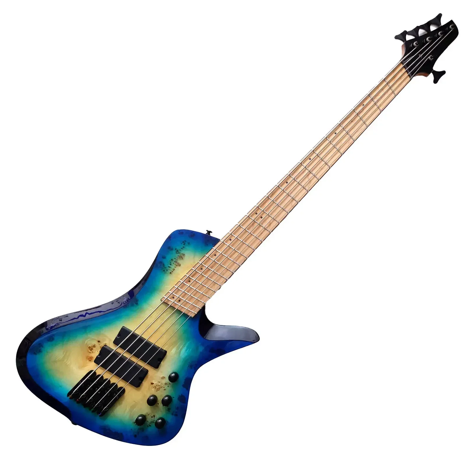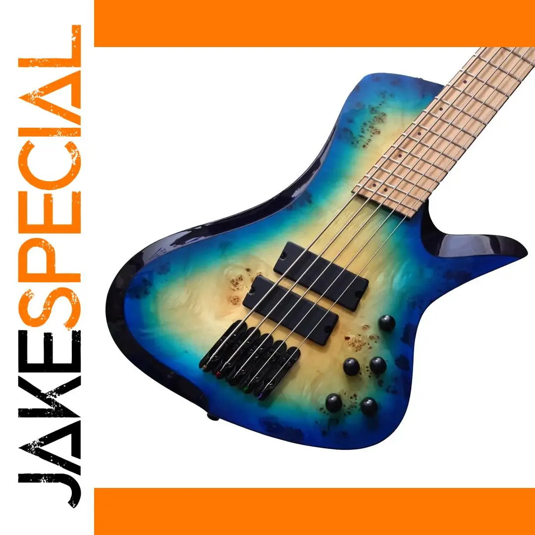 Experience the perfect blend of modern style and high-performance features with this stunning five-string bass guitar. Its striking blue burst gloss finish transitions from deep blue at the edges to softer hues at the center, accentuated by a beautiful burl wood top that adds a unique artistic touch. The sleek, contoured body and unconventional shape make it a true stage-ready instrument that commands attention. Equipped with a lightweight roasted maple neck and fretboard, satin-finished for smooth playability, this bass delivers a bright, punchy sound with excellent attack and decay. The luminous side dots and black hardware create a bold, sophisticated look that inspires confidence every time you perform. Whether you're in the studio or on stage, this bass's dynamic aesthetic and advanced features elevate your musical journey.