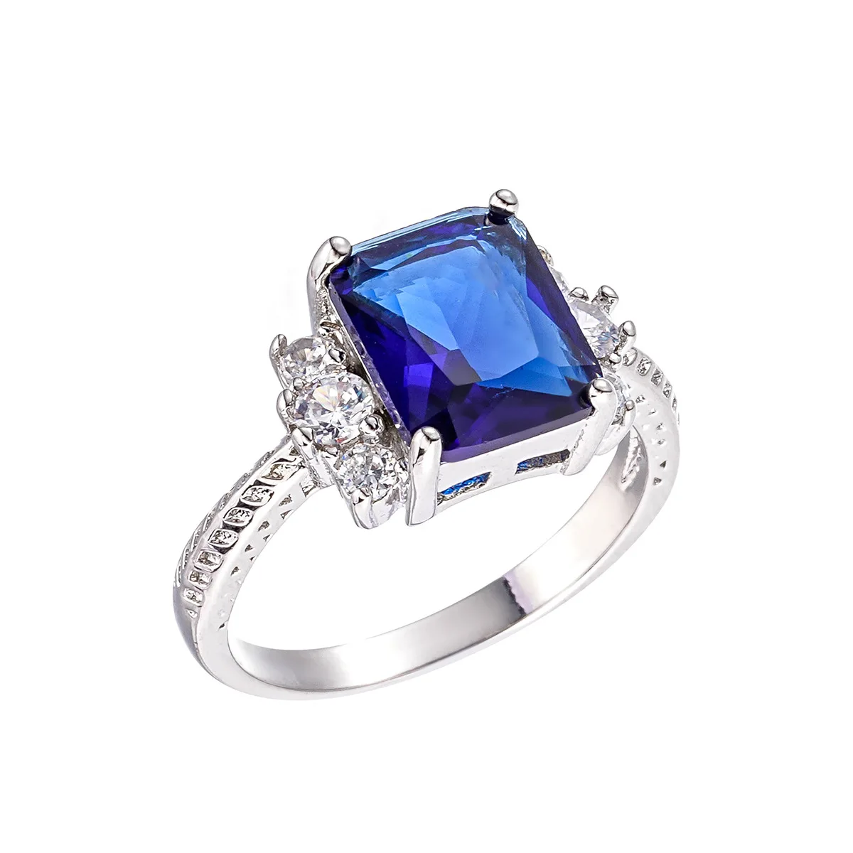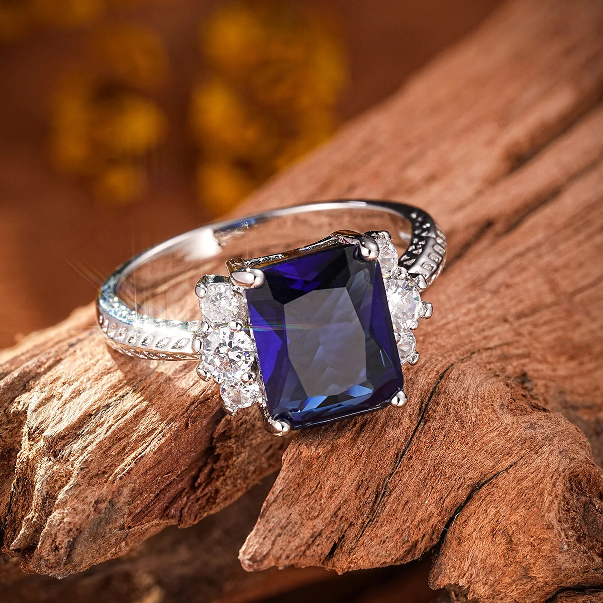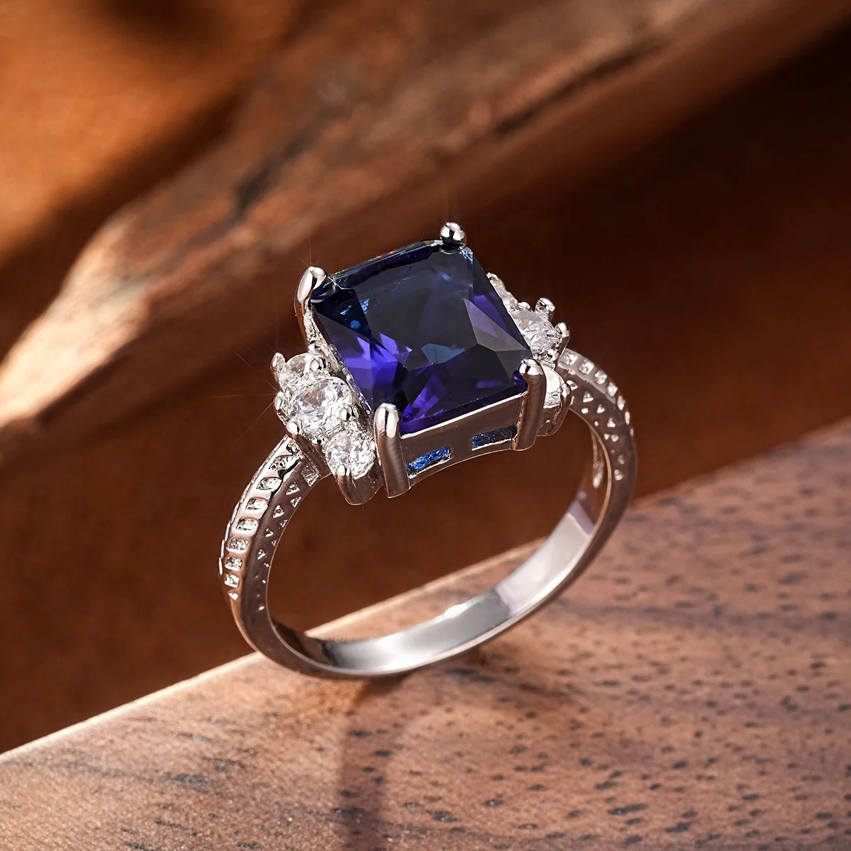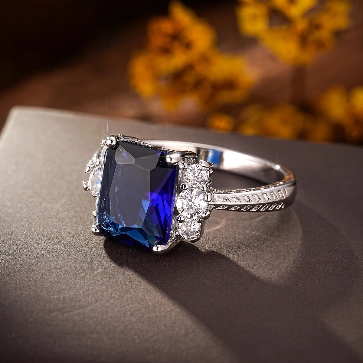 Elevate your style with this luxurious geometric blue cubic zirconia ring featuring a silver-plated brass band coated with 925 silver. The design showcases a striking rectangular emerald-cut deep blue zirconia centered with prong settings, flanked by clusters of clear white cubic zirconia on each side. Available in sizes US 6, 7, 8, 9, and 10, with internal lengths from 49.3 cm to 62.1 cm, it combines sophistication and durability, ideal for parties, weddings, or special occasions. Its minimalist yet elegant style is perfect for gifting, making it a versatile accessory to add a touch of modern luxury to any ensemble.