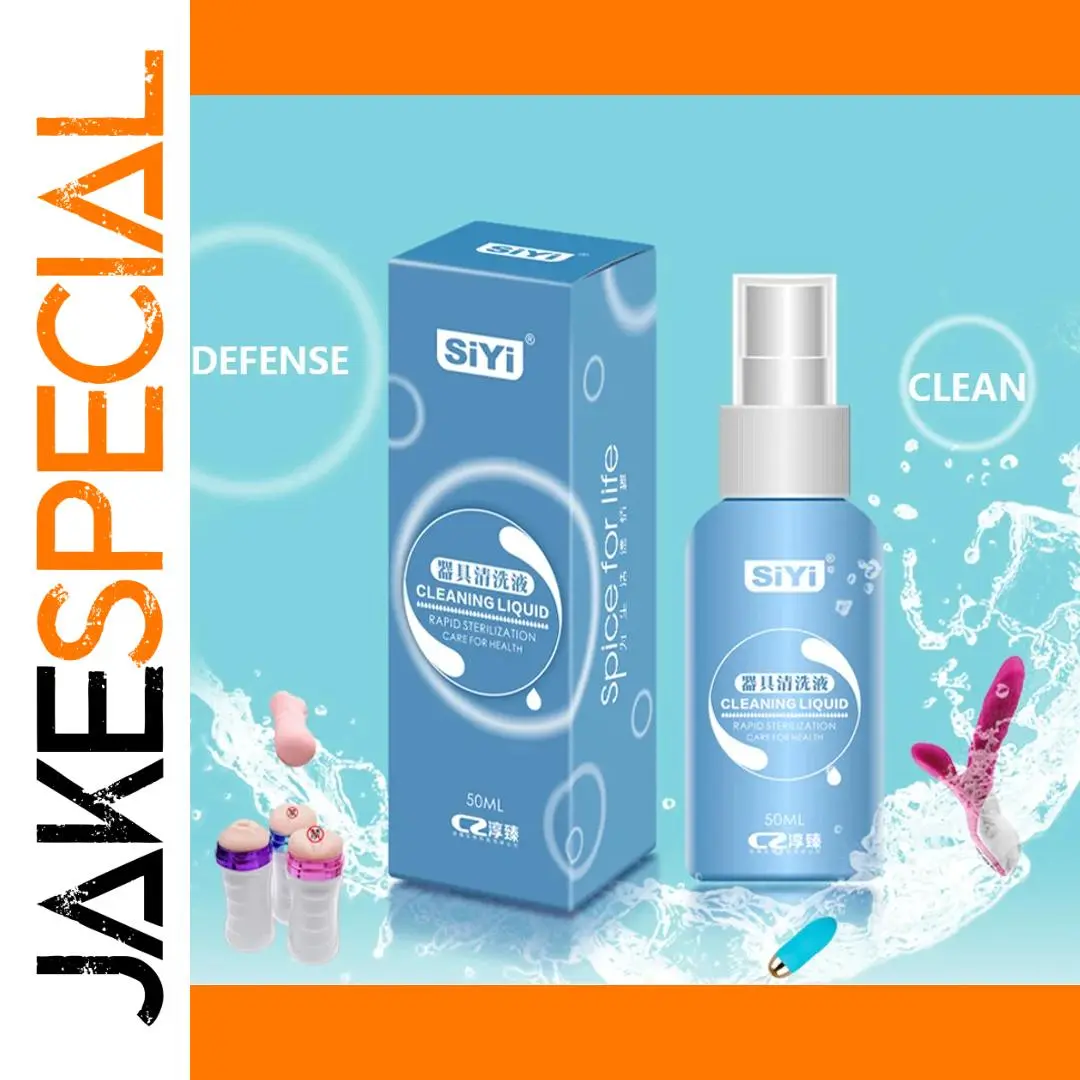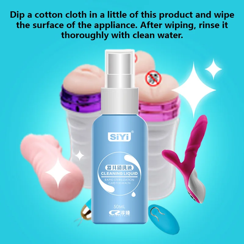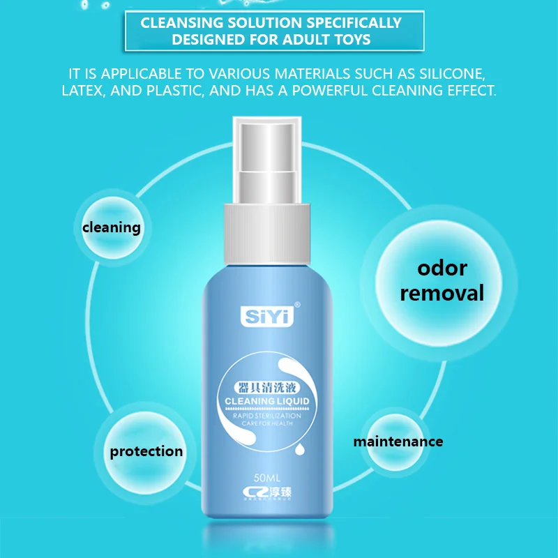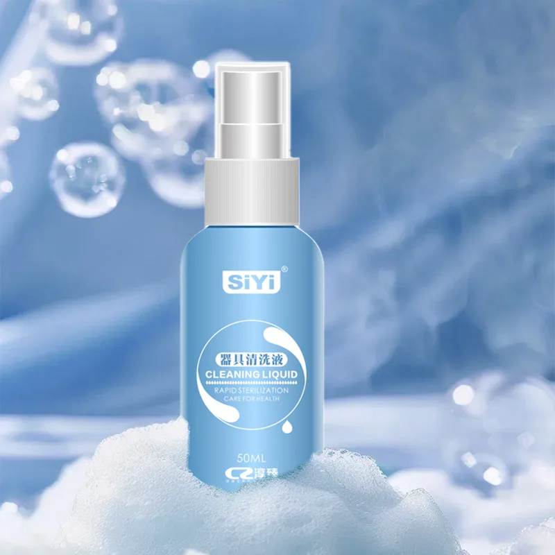 Experience a sense of cleanliness and confidence with this this antibacterial spray designed specifically for adult sex toys. Its sleek, cylindrical, semi-transparent light blue bottle with a white pump provides an elegant, modern look. The label features bold white text on a soothing blue background, accented with water droplets and bubbles, symbolizing freshness and hygiene. Perfect for quick, effective sterilization, this spray offers peace of mind after every use, ensuring your intimate experiences are safe, clean, and healthy. Its water-based, unscented formula contains no harsh chemicals, making it gentle yet effective. Compact and easy to use, this disinfectant spray fits comfortably into your routine, enhancing your personal care with simplicity, confidence, and a touch of modern elegance.