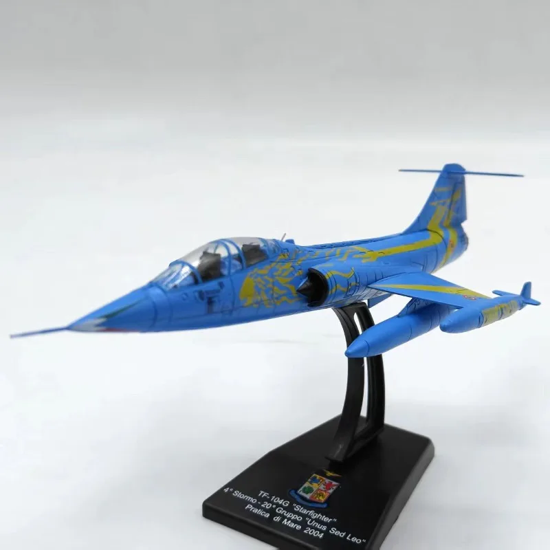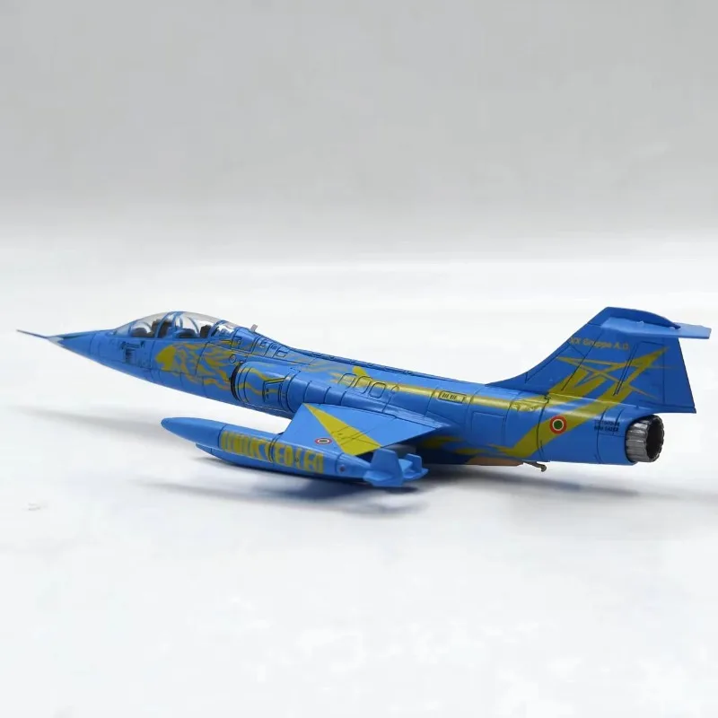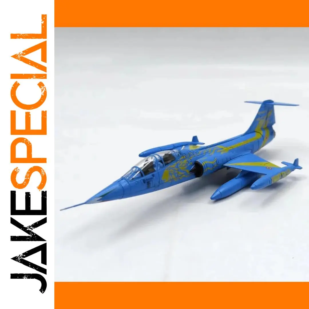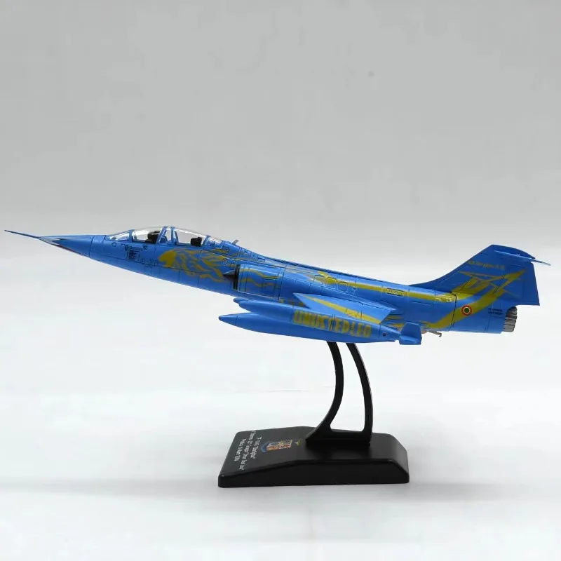 Imagine adding this striking blue F-104 fighter jet model to your collection. Crafted with meticulous detail from alloy and plastic, it captures the sleek, aerodynamic design and aggressive profile of the original aircraft. The vibrant blue finish is complemented by bold yellow markings, highlighting wings, fuselage, and tail fin, creating a captivating contrast. Its finely crafted surface features precise lines and a dark-tinted cockpit canopy, adding realism. External missile mounts or fuel tanks in matching colors enhance its military aesthetic. With its slender tail fin and swept-back wings with winglets, this model exudes speed and agility. Perfect for display, it will enhance your collection with its intricate detailing and vibrant color scheme.