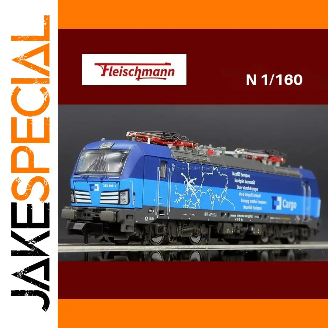 Experience the modern elegance of this blue Fleischmann electric locomotive, designed at a 1:160 scale to perfectly fit your model train collection. Its contemporary aerodynamic shape features angular fronts and sloped windshields, providing a realistic and visually striking appearance. The transparent windows reveal a clean, minimalist interior, while the side displays a bold white Europe map alongside “Cargo” branding, emphasizing its freight role. The roof is detailed with red and black pantographs and electric insulators, replicating real-world electric locomotives. The black undercarriage and wheelsets highlight intricate suspension and mechanical details, making it an ideal display piece or functional model for train lovers. This model promises authenticity, aesthetic appeal, and the chance to bring your railway setup to life with a stunning, realistic locomotive.