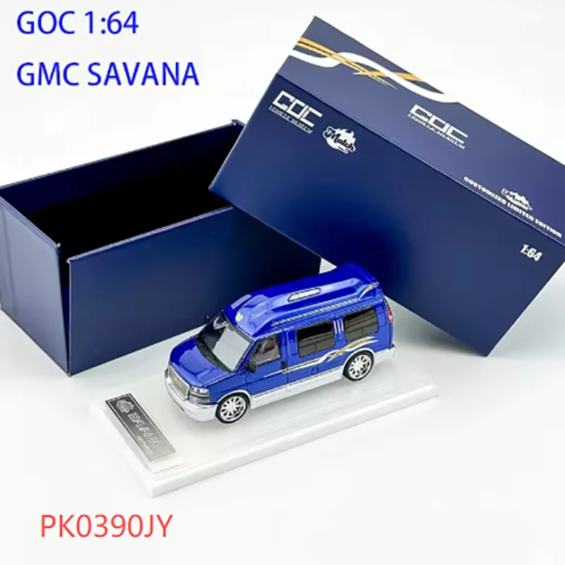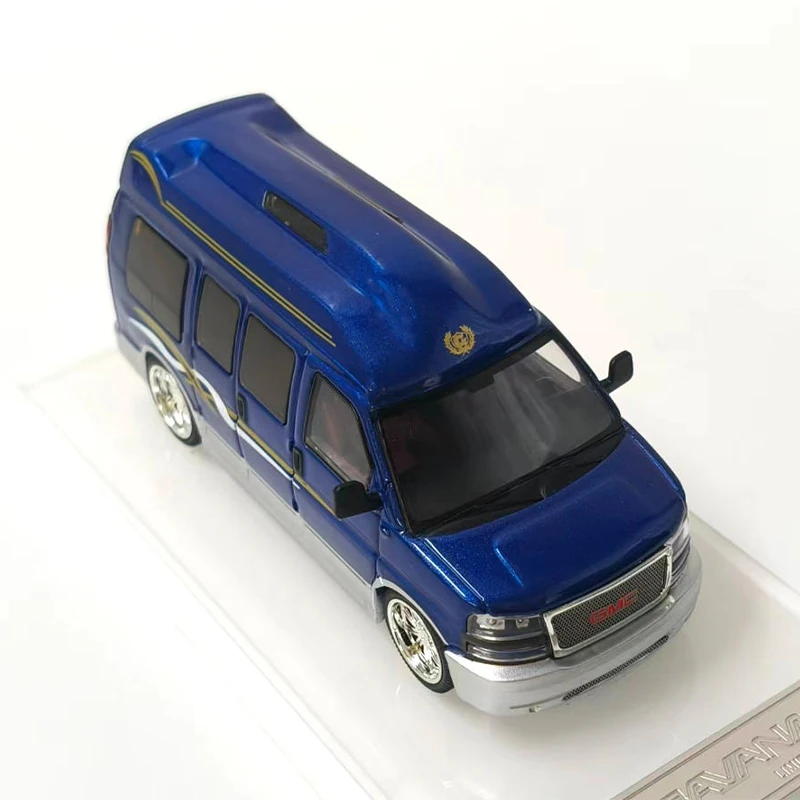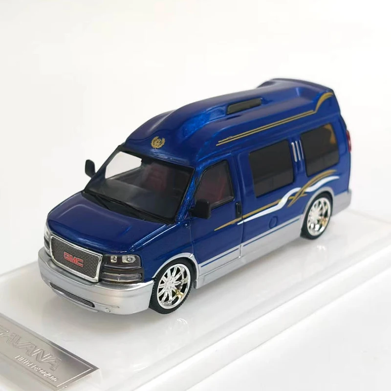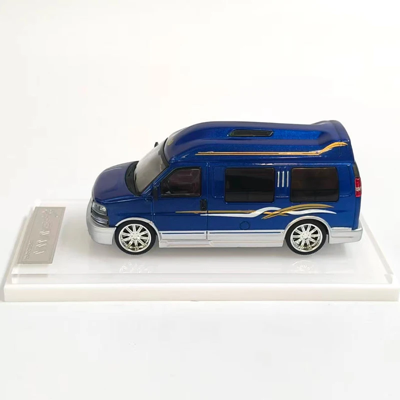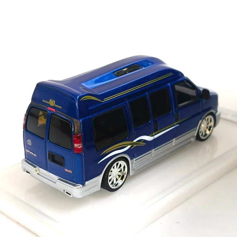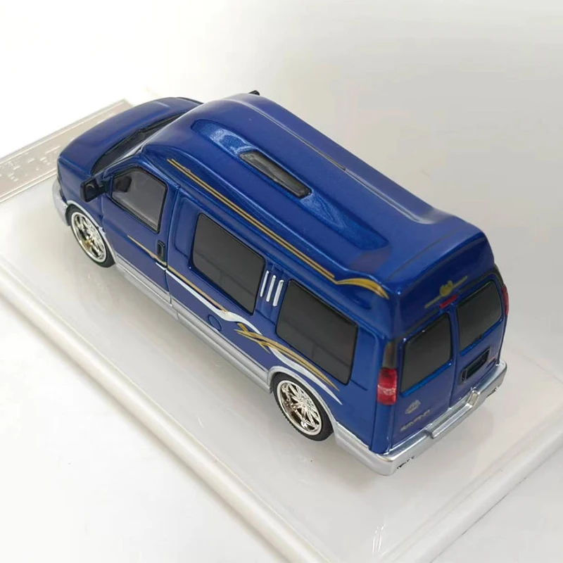 Imagine showcasing this beautifully crafted 1:64 scale diecast alloy model of a GM SAVANA, bringing a touch of elegance and realism to your collection or display. The vibrant, glossy blue finish immediately catches the eye, accented with fine gold and silver striping that adds a sophisticated touch. Every detail has been carefully molded, from the finely detailed front grille with its dark grid pattern and bold red emblem, to the tinted black windows that contrast strikingly against the bright exterior. The white rims with detailed tread tires, along with subtle features like door contours, roof vents, and tail lights, make this model a true miniature masterpiece. It’s perfect for decorating your space or as a memorable gift for vehicle enthusiasts.