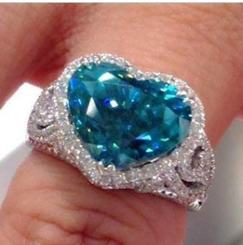 - The ring boasts a large, faceted, heart-shaped gemstone in a vivid blue hue, which catches and reflects light beautifully, creating a stunning visual impact for any occasion.