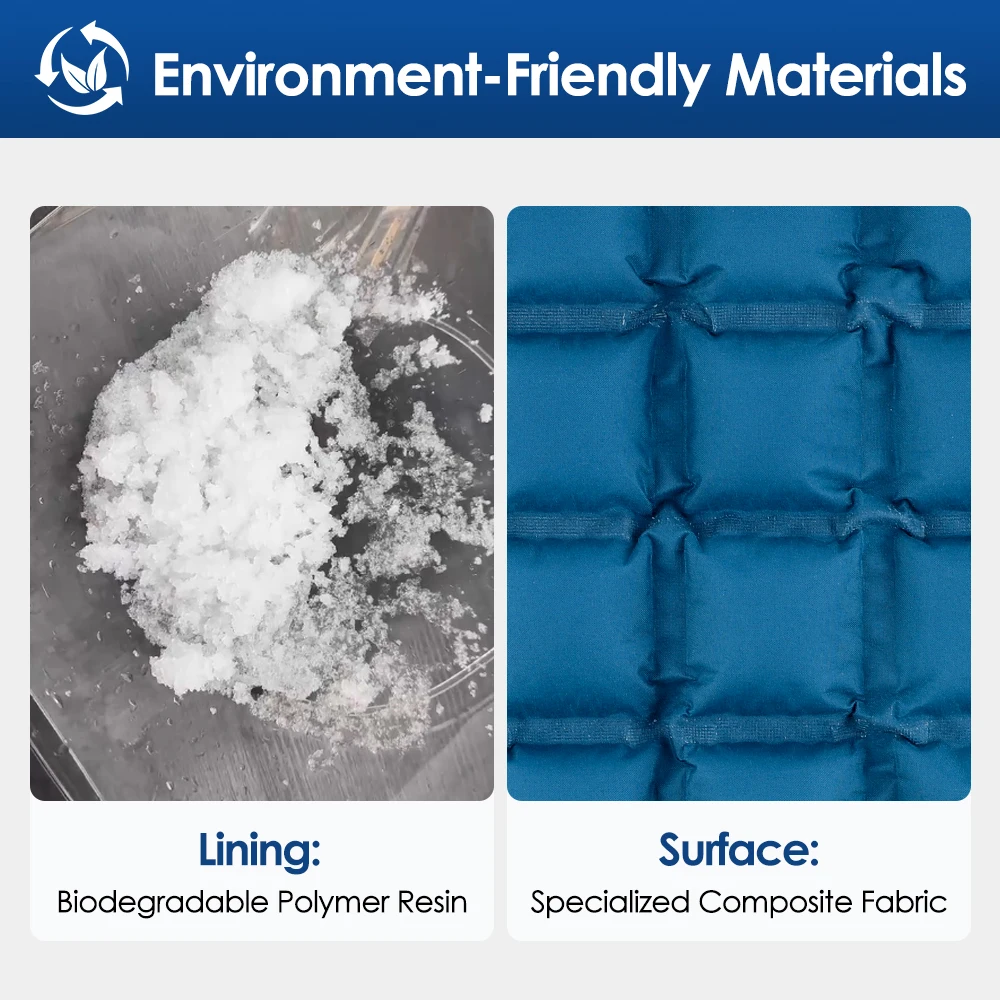 - Made from biodegradable polymer resin and polyester Pongee, this environmentally conscious pad is safe, reusable, and restores full functionality after re-soaking in water for 30+ minutes.