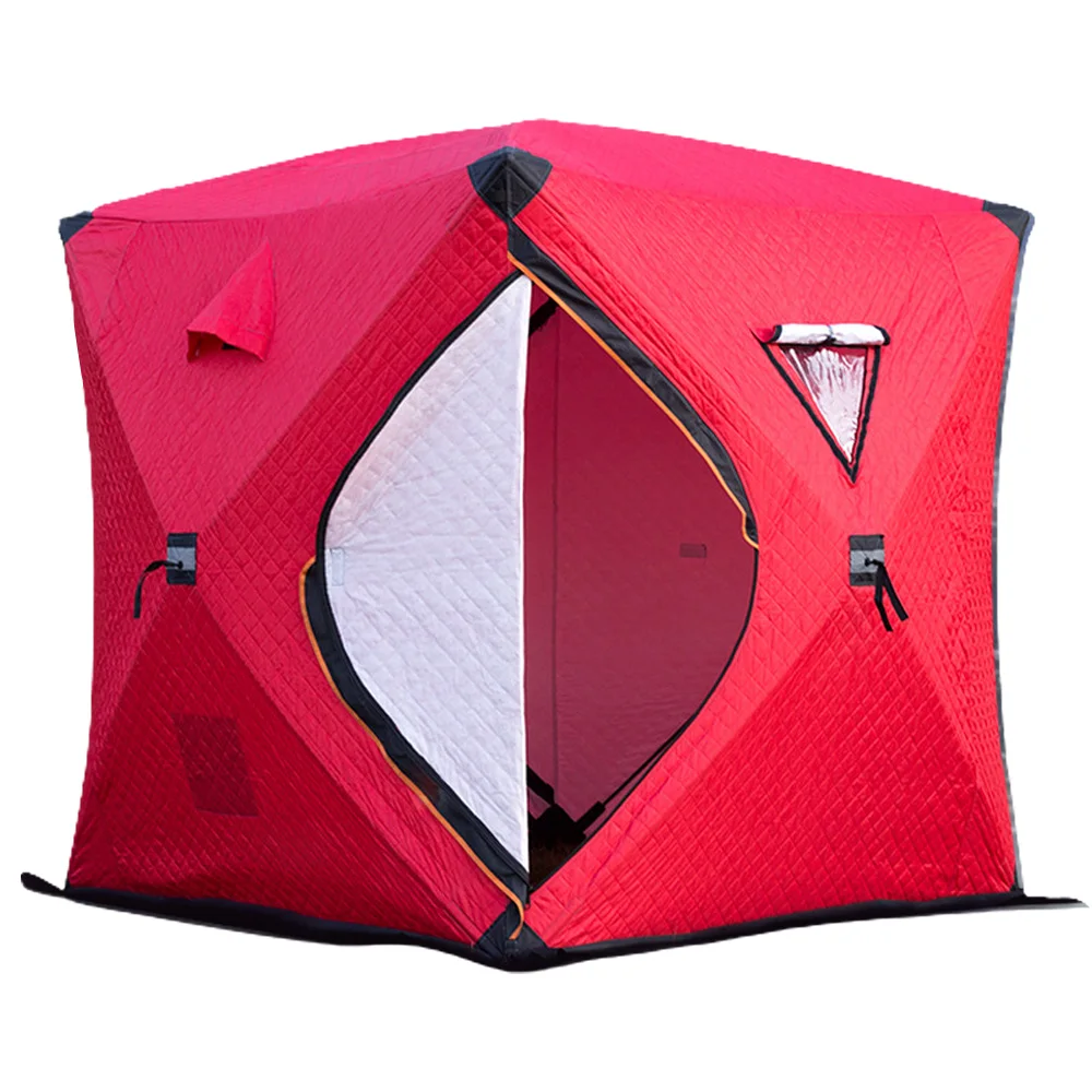 Experience ultimate winter fishing with this portable ice fishing shelter, measuring 210 x 180 x 180 cm (82.7 x 70.9 x 70.9″) and weighing 11,000 grams (24.3 pounds). Crafted from durable, waterproof oxford cloth with a coating and three-layer cotton insulation, it ensures warmth and protection against snow and wind. The aluminum frame with 9.5 mm poles provides sturdy support, while features like double doors, vent holes, and internal pockets enhance convenience and airflow. Complete with four ice pegs and ropes for secure anchoring, available in vibrant blue, red, orange, or camouflage, this shelter makes icy adventures more comfortable and reliable.