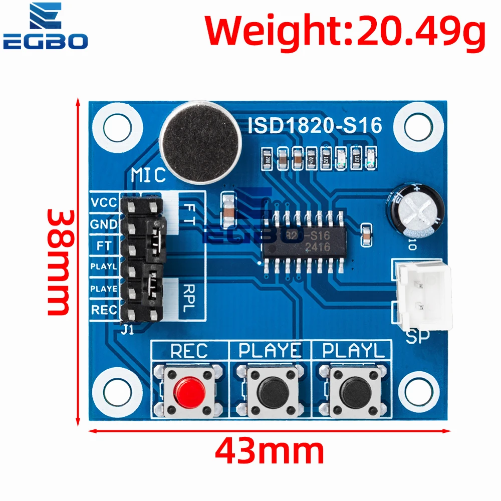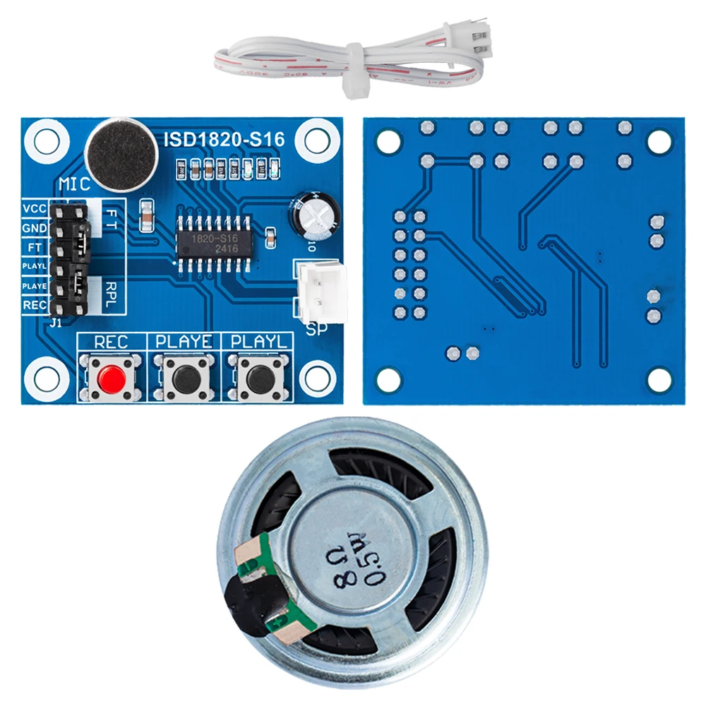 Imagine enhancing your projects with this sleek, compact, and highly functional recording module. Measuring just 42.8mm by 38.5mm with a slim profile of 12mm, this blue-colored PCB combines modern design with practicality. Crafted from durable FR4 material and equipped with essential components like a microphone, loudspeaker, and white ribbon cable, it offers excellent versatility for electronics enthusiasts. The module's compact size and lightweight of 22 grams make it perfect for embedding into various devices, from custom audio projects to educational demonstrations. Its voltage range from DC 3V to 5V and power dissipation of only 0.5W ensure reliable performance while maintaining energy efficiency. Enjoy a seamless experience with this new, customized SMD device designed for precise voltage regulation and multi-application use.