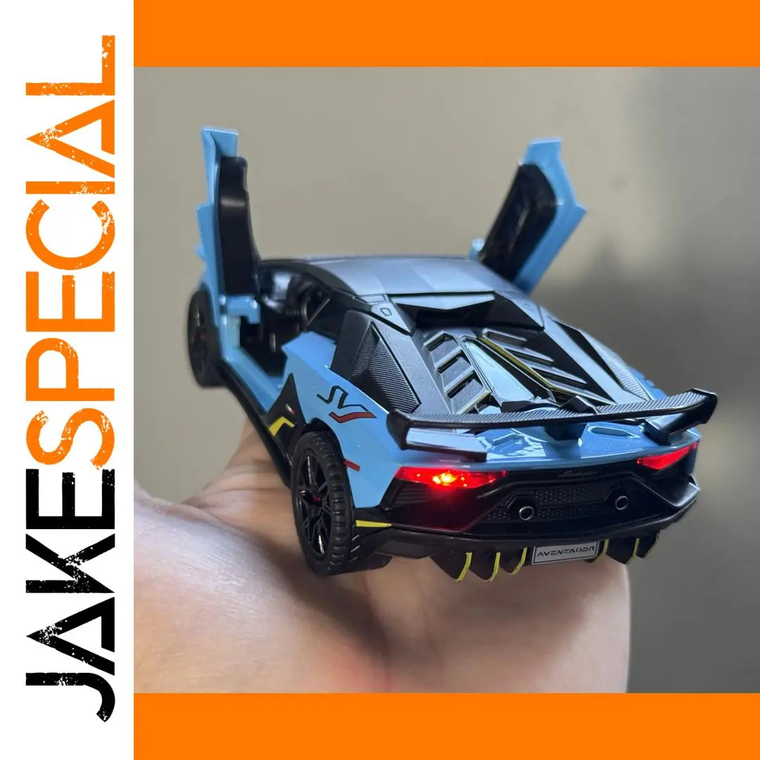 Imagine owning this meticulously crafted miniature replica of the iconic Lamborghini Aventador SVJ. With a vibrant blue finish accented by sleek black details, this 1:32 scale diecast model captures the essence of the original supercar’s sporty elegance. Its aerodynamic design includes a prominent rear spoiler, vented hood, and realistic louvers, highlighting its high-performance character. Open the upward-sloping doors to reveal a detailed black interior, including a cockpit with a dashboard and steering wheel. The black multi-spoke wheels with rubber tires and LED-style tail lights add to its dynamic presence. Perfect for collectors or enthusiasts, this model combines aesthetic appeal with high-quality craftsmanship for a true to life display piece.