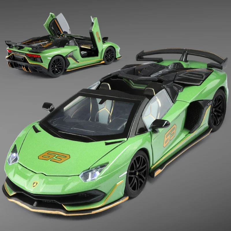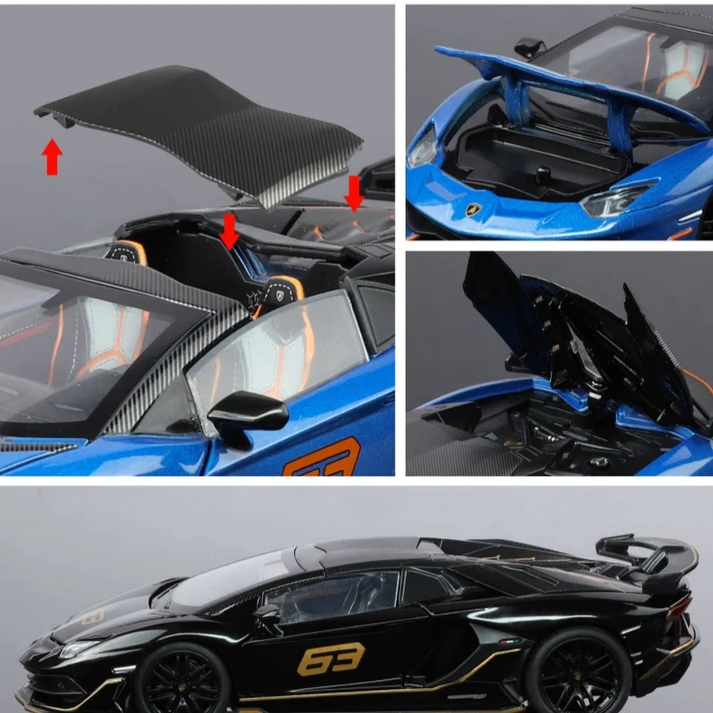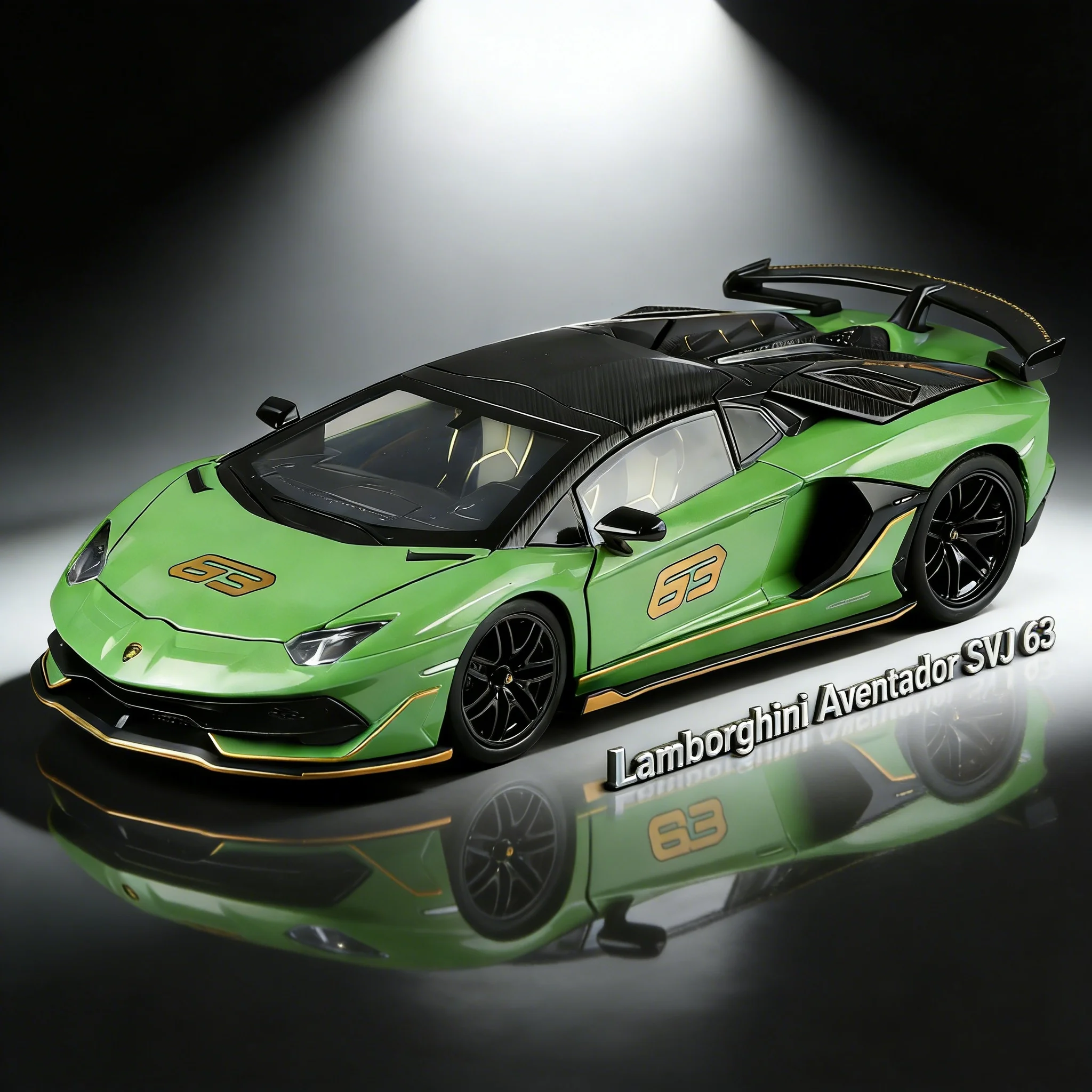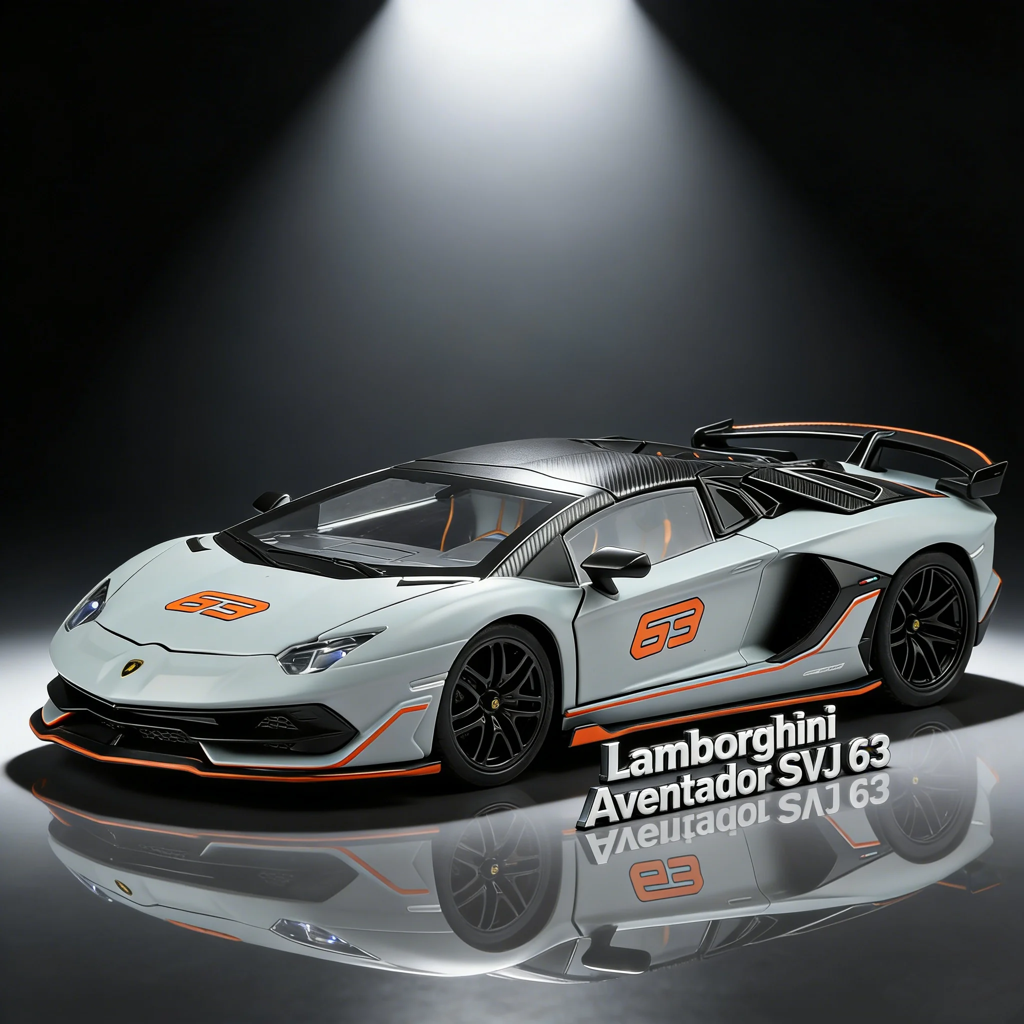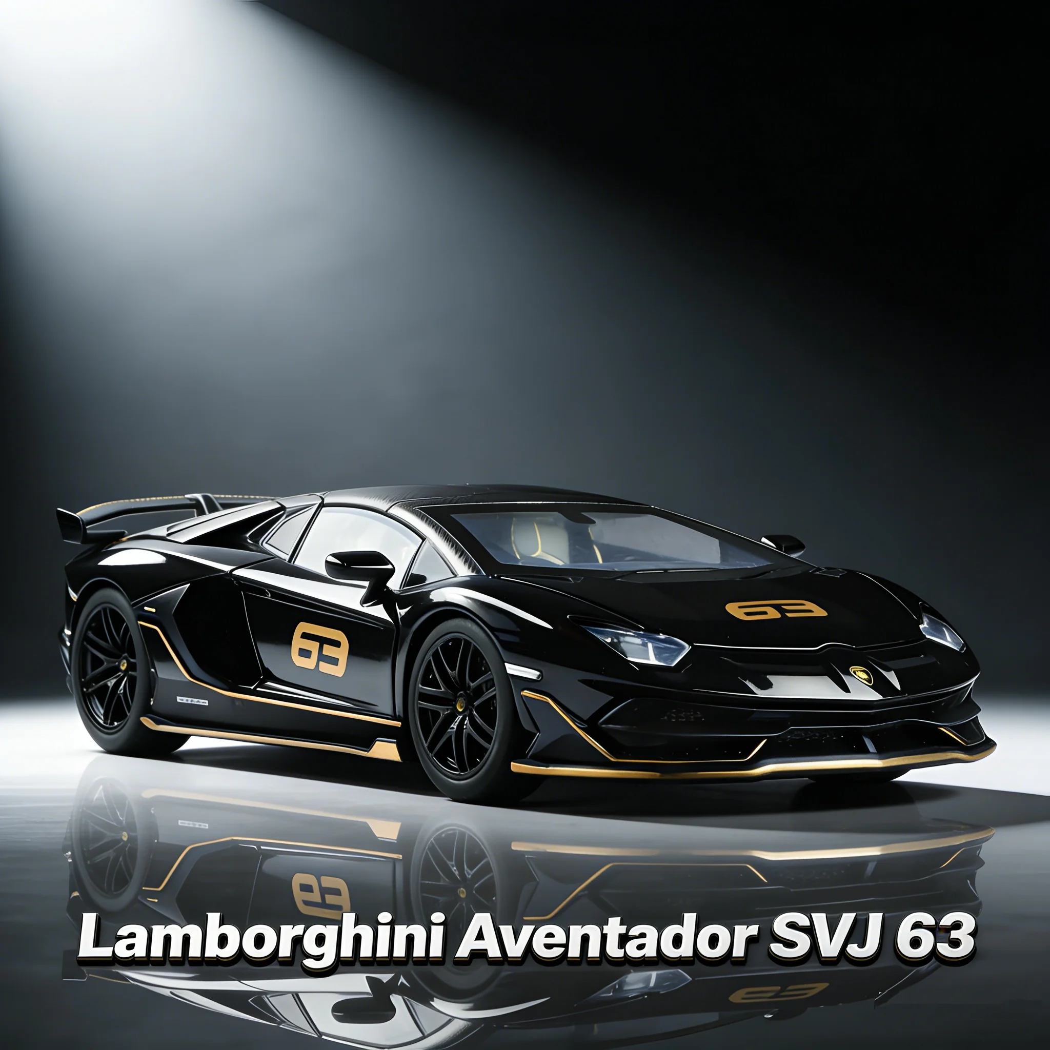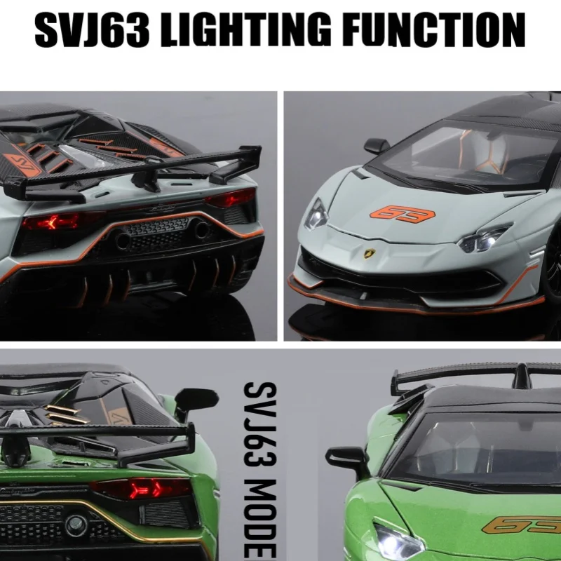 - Made from high-quality alloy and plastic, providing durability and a premium feel, accurately replicating the sleek silhouette of the Lamborghini Aventador SVJ 63 in 1:32 scale.