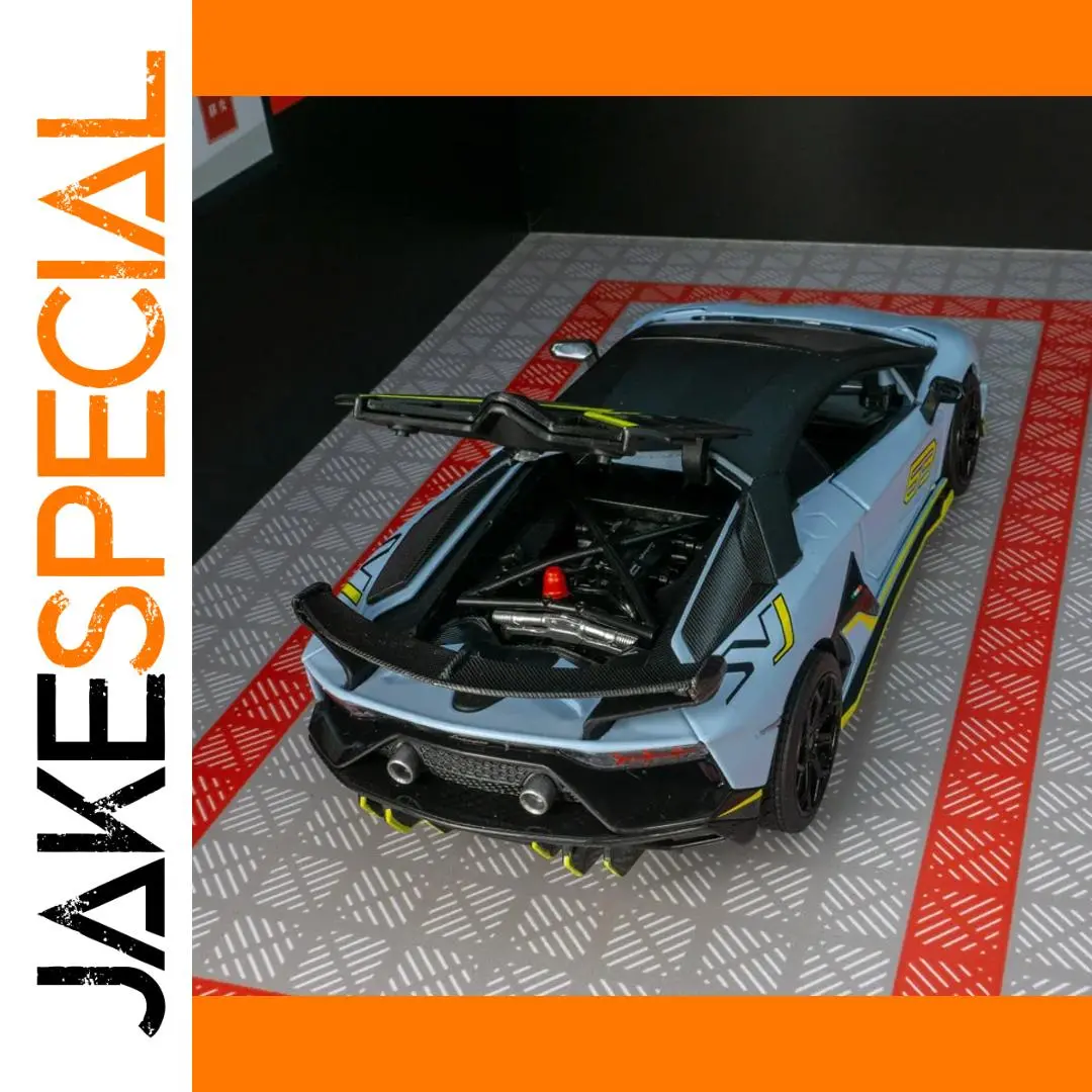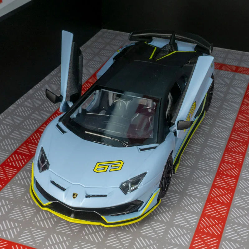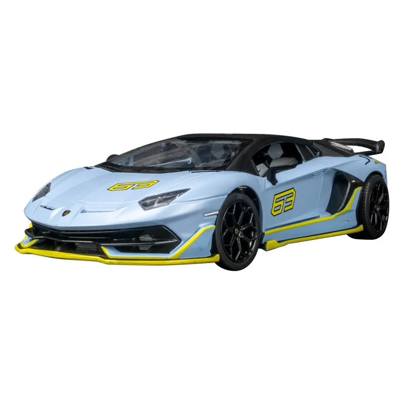 Experience the thrill of owning this meticulously crafted 1:24 scale diecast replica of the Lamborghini Aventador SVJ63. Its sleek, aerodynamic silhouette is finished in a vibrant metallic light blue, evoking a high-performance aesthetic. The model features intricate detailing, including a textured black roof reminiscent of carbon fiber, bold yellow accents on the side skirts and rear wing, and sharp multi-spoke black rims that contrast beautifully with the body. The front showcases a sporty grille with integrated air intakes, while the rear highlights a prominent rear wing and twin exhaust pipes surrounded by a textured diffuser. The doors are functional, opening to reveal detailed interior components, perfect for display or collection. This model captures the iconic, aggressive style of Lamborghini with precision and elegance.