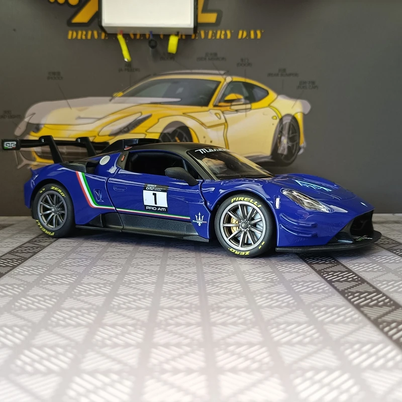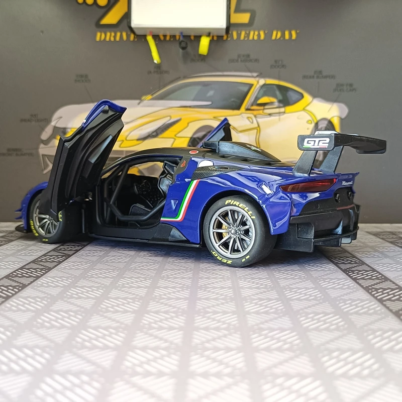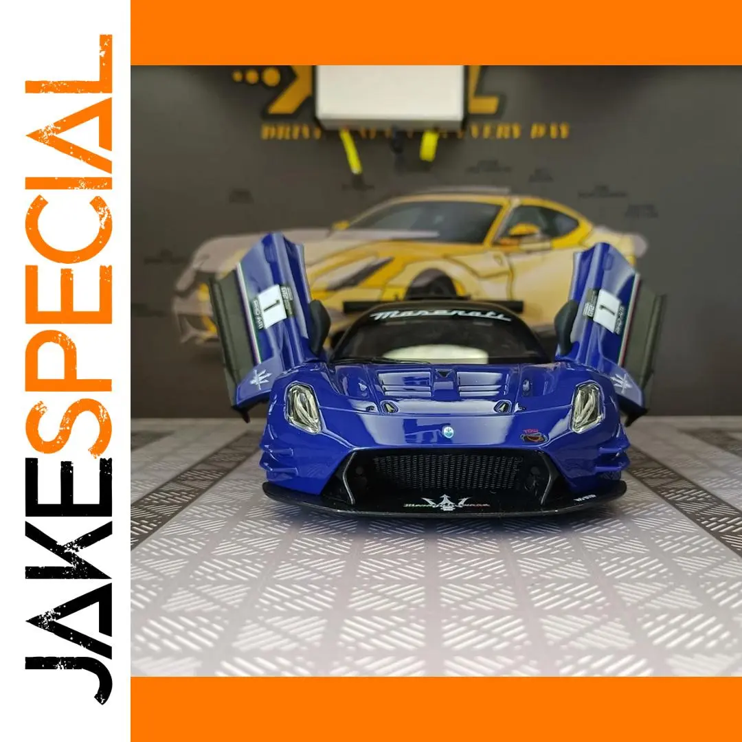 Immerse yourself in the elegance of this highly detailed 1:24 scale diecast replica of the Maserati GT2 2023 supercar. With a vibrant glossy blue finish, the model captures the sleek, aerodynamic lines and aggressive stance of the real vehicle. Its realistic features include sharply sculpted headlights with clear lenses, a bold black mesh grille, and an integrated aerodynamic splitter with vents and air intakes. The doors open in a butterfly style, revealing a dark, intricately crafted interior that complements the high-quality craftsmanship. Perfect as a static display or collectible, this model embodies luxury and performance in a compact, artistic form—ideal for enthusiasts who cherish detailed craftsmanship.