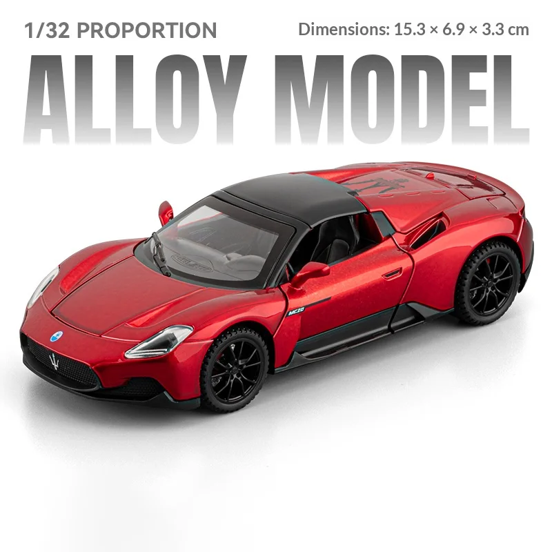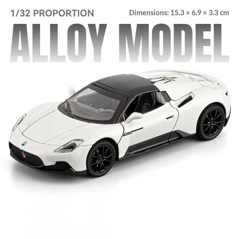 Experience the thrill of the Maserati MC20 with this detailed 1:32 scale diecast alloy model, perfect for adult collectors. The sleek, aerodynamic design features a vibrant light blue finish with contrasting black roof and accents, precise headlights, a detailed grille with Maserati trident emblem, black multi-spoke wheels with rubber-like tires, and realistic air vent details. Equipped with sound and light effects and a pull-back racing mechanism, this high-quality model captures the essence of a high-performance supercar. Suitable for ages 14 and above, it offers an authentic and captivating display piece for car enthusiasts and collectors alike.