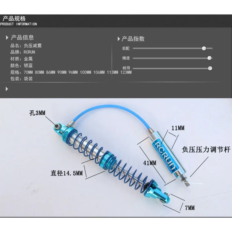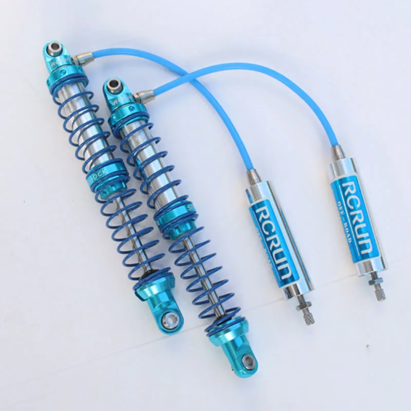 Transform your 1/10 scale RC crawler with these sleek, blue metal negative pressure damping shock absorbers. Designed for models like Traxxas TRX4, TRX6, Axial SCX10 II, and RC4WD D90, these shocks offer a perfect upgrade to improve suspension handling and ride quality. Their modern cylindrical design features a polished metallic finish, complemented by coiled springs wrapped around the damping units for a cohesive look. Available in sizes ranging from 70mm to 123mm, each set of two is engineered for durability and precision. Easy to install with mounting screws, they are compatible with four-wheel drive vehicles and require no power supply or batteries. Elevate your RC experience with this premium upgrade that combines visual appeal with functional excellence.