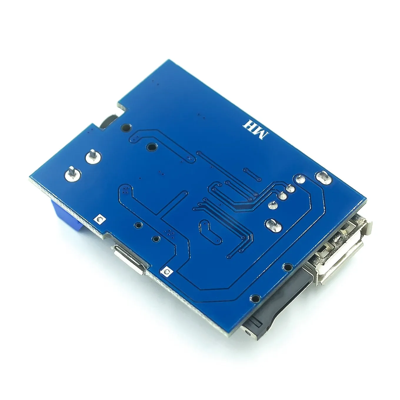 Step into a world of seamless audio experience with this compact blue MP3 decoder module. Designed with a sleek rectangular PCB measuring 45mm by 36mm, it combines modern aesthetics with powerful functionality. The vibrant blue circuit board is complemented by metallic silver USB ports, copper traces, and glossy gold-plated 3.5mm headphone jack, creating a striking visual appeal. The tactile black push buttons and functional switches are intuitively laid out for easy control of playback, volume, and modes. With a smooth, expertly arranged surface-mounted component design, this built-in amplifier and decoder module promises high-quality sound output and reliable performance. Its visually appealing yet practical style makes it suitable for a variety of custom audio projects.