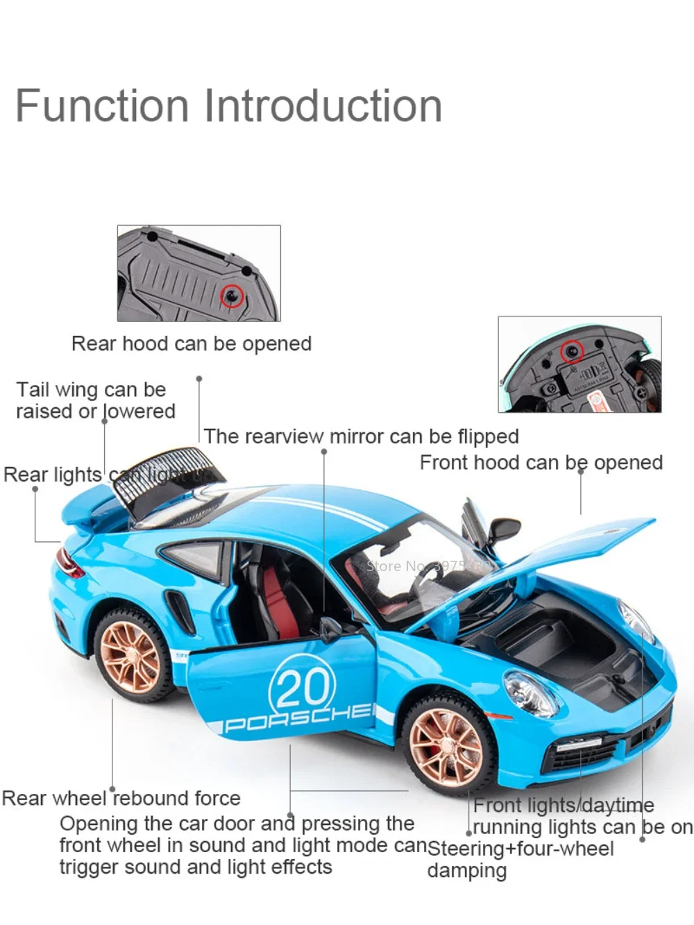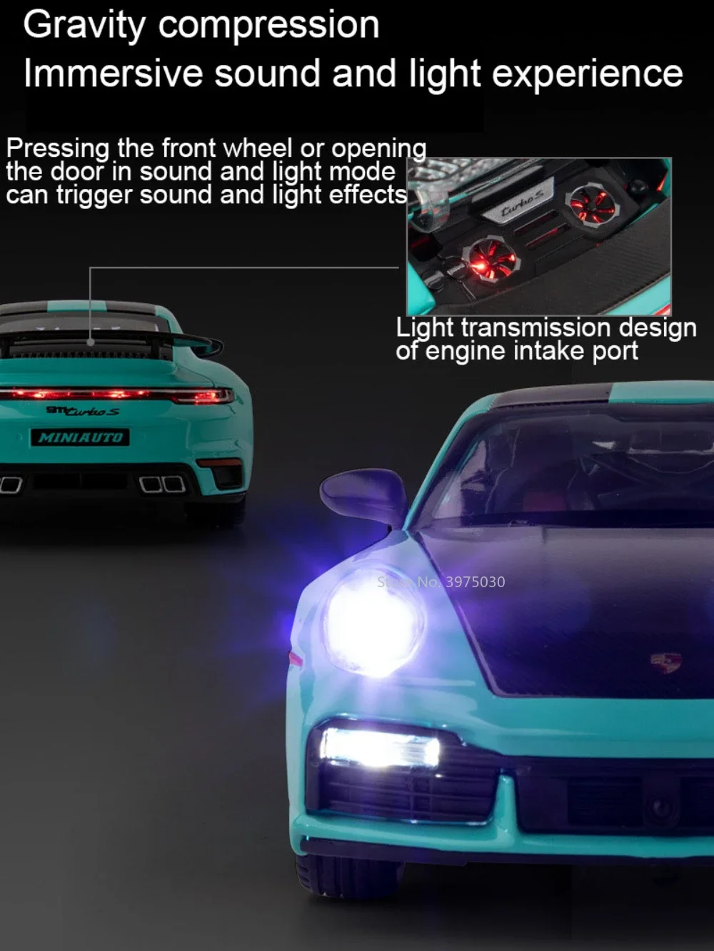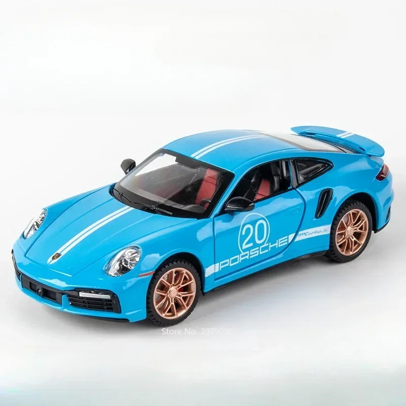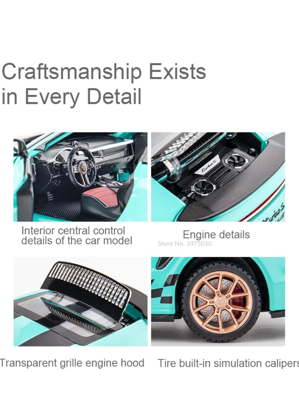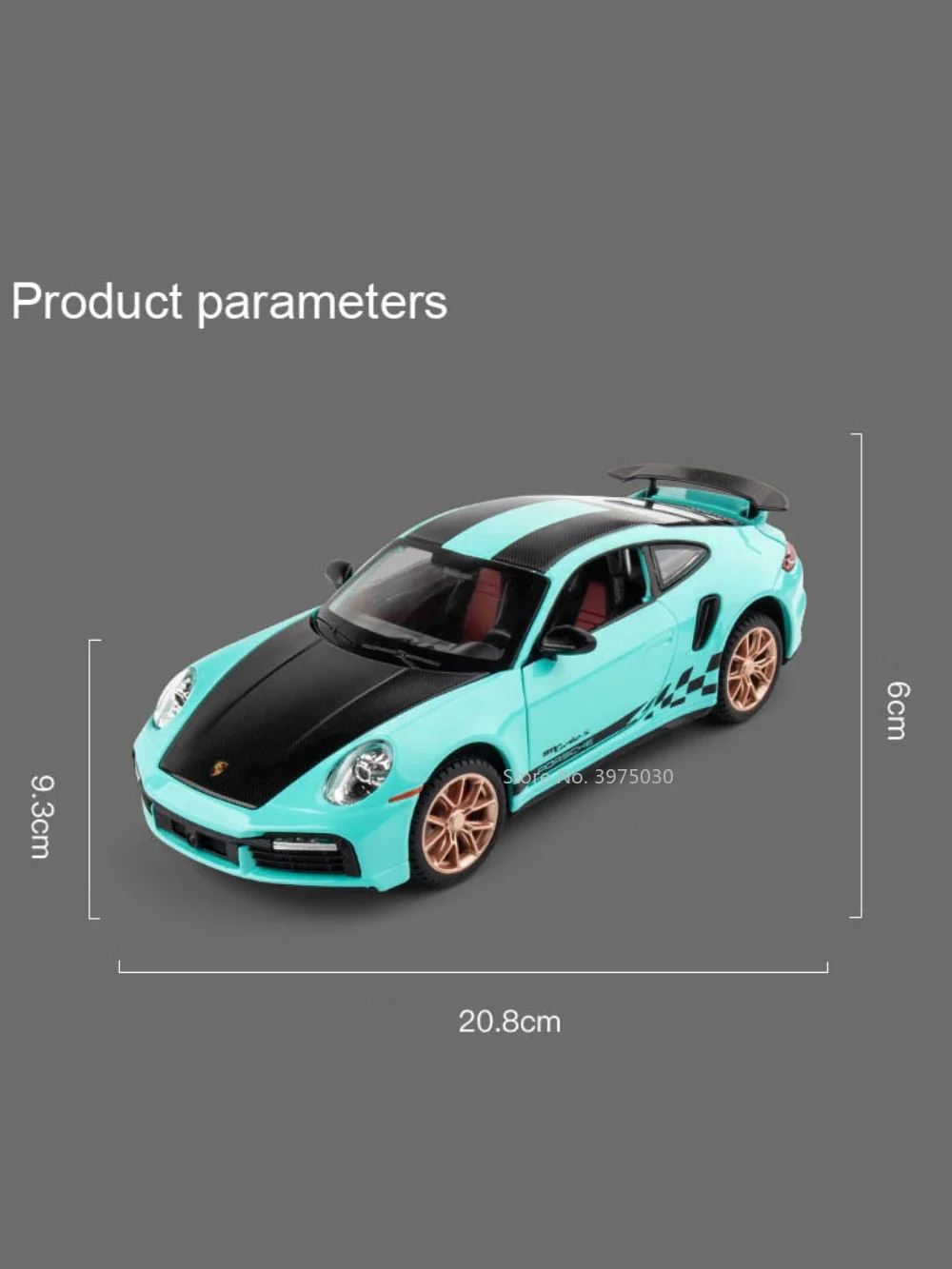 Imagine yourself adding this stunning miniature to your collection, immediately enhancing your display with its eye-catching, bright turquoise body. Designed with meticulous craftsmanship, this diecast alloy car captures the sleek, high-performance essence of the Porsche 911 GTR CSR2. Its contrasting black accents on the hood, roof, and side mirrors add an aggressive touch, while the gold multi-spoke alloy wheels and checkered stripe evoke a racing pedigree. The realistic panel lines, vents, rear spoiler, and subtle door handles bring authentic detail to this scaled model. Whether as a hobbyist or a collector, this model will elevate your automotive collection and inspire admiration wherever displayed.