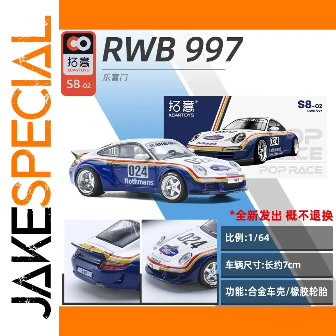 - Painted in a vibrant RWB 997 blue with striking racing stripes and detailed sponsor decals for an authentic racing appearance.