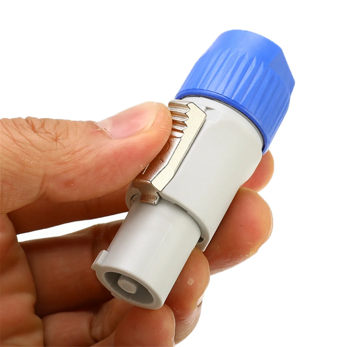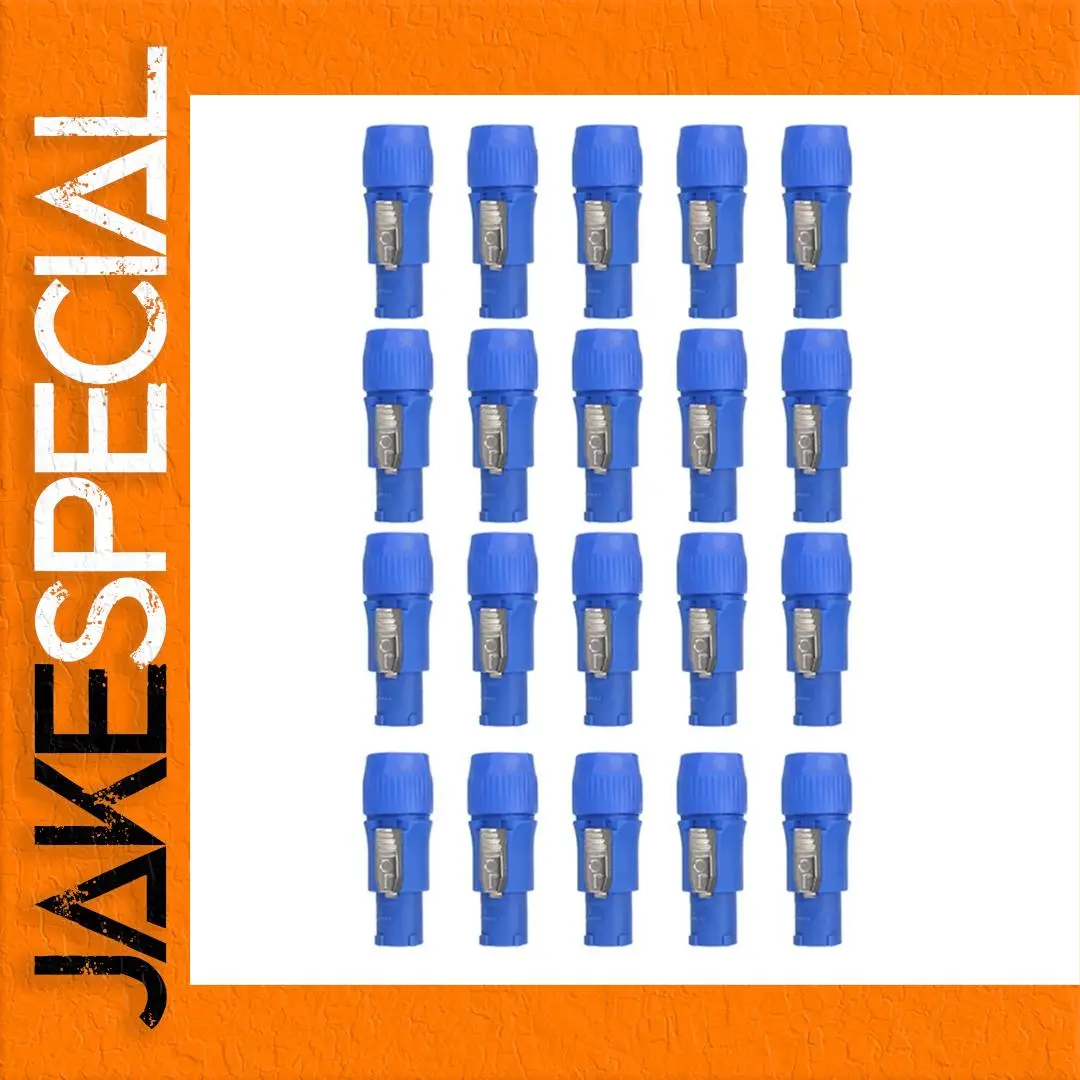 Enhance your stage lighting setup with this set of 20 lockable AC PowerCon connectors, rated for 20A and 250V. Designed with a sleek blue plastic body and a textured, ribbed threaded cap, these connectors feature a robust rotary locking system for secure, reliable connections. Each connector includes three pre-grounded contacts, ensuring safety and stability. Their ergonomic design provides ease of use, making them ideal for professional high-power applications where secure locking is essential. Organize your connection points efficiently with these uniform, modern connectors that combine functionality with a clean, vibrant aesthetic, giving you peace of mind during your performances or events.