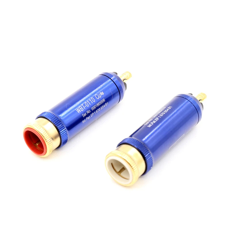 Experience superior audio fidelity with this set of four RCA connectors featuring the -0110Cu signature, crafted from high purity copper and gold-plated for optimal signal transmission and corrosion resistance. Designed for soldering, each connector supports cables up to 9mm in diameter and includes a T6 Torx screw for secure strain relief attachment. Capable of handling bandwidths up to approximately 200 MHz, these connectors offer excellent electromagnetic shielding (EMI), ensuring stable and clear sound transmission. Their sleek, high-quality design combines durable materials with precision engineering, making them an ideal choice for high-end audio setups.