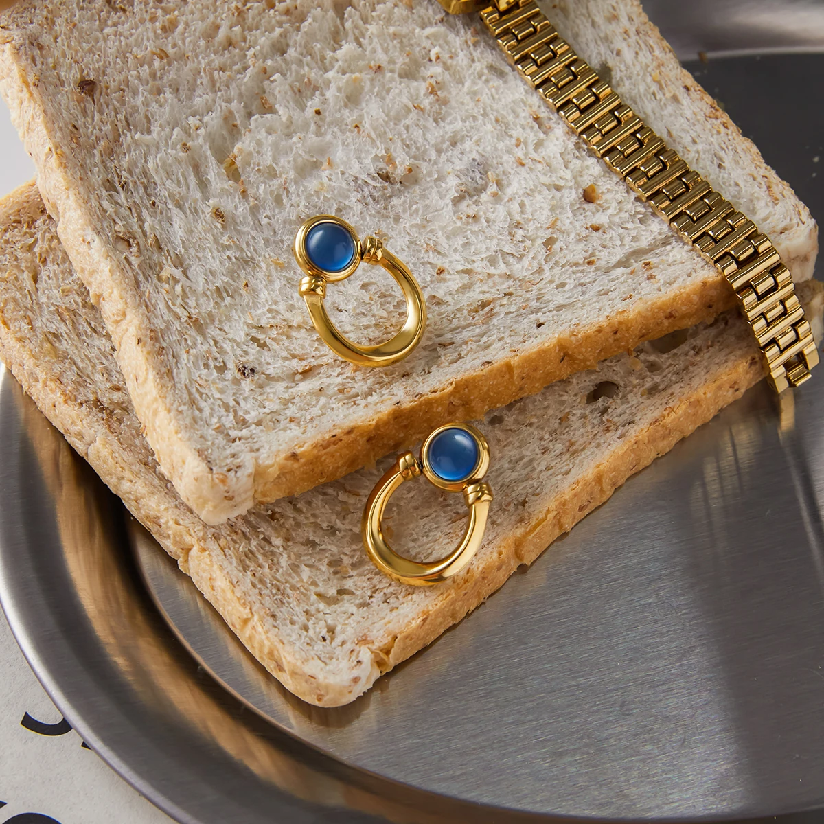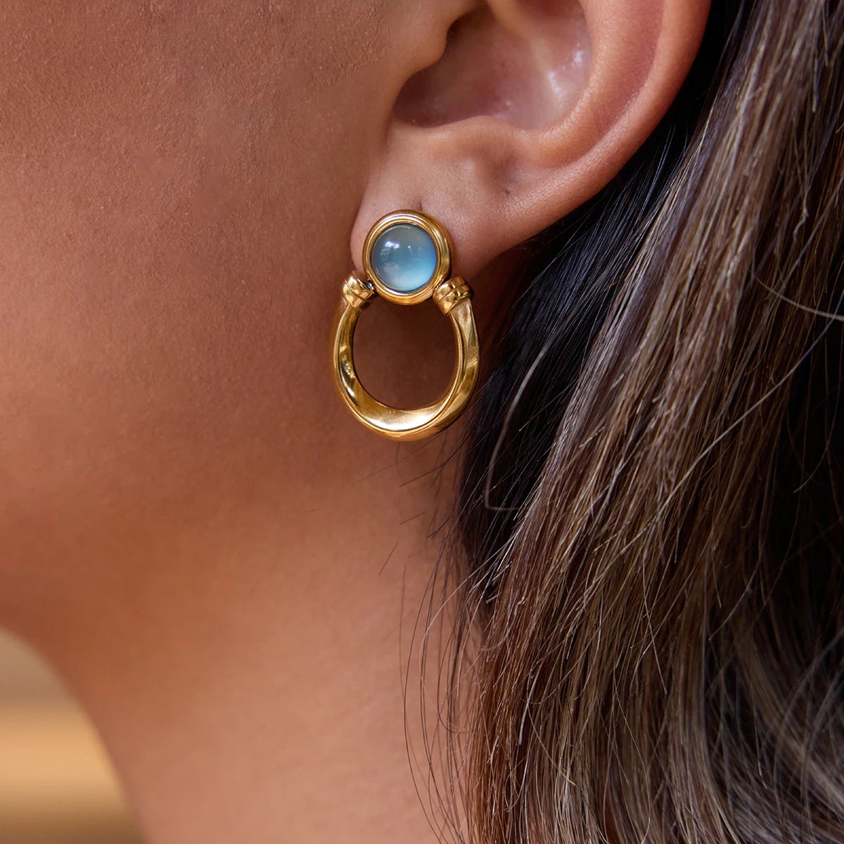 Step into style with these trendy women's earrings, expertly crafted from stainless steel with a sleek platinum finish. Featuring a distinctive round shape and a vibrant blue resin horseshoe design, these earrings effortlessly combine modern flair with elegance. The glossy, gemstone-like resin enhances their eye-catching appeal, while the gold-tone bezel adds a luxurious contrast. The chunky, polished hoop dangles below, creating a balanced, bold silhouette suitable for any fashionable occasion. Designed for comfort and durability, these hypoallergenic earrings feature a secure push-back stud fastening, making them perfect for everyday wear or special outings. Their contemporary aesthetic will elevate your jewelry collection, reflecting your confident, stylish personality.