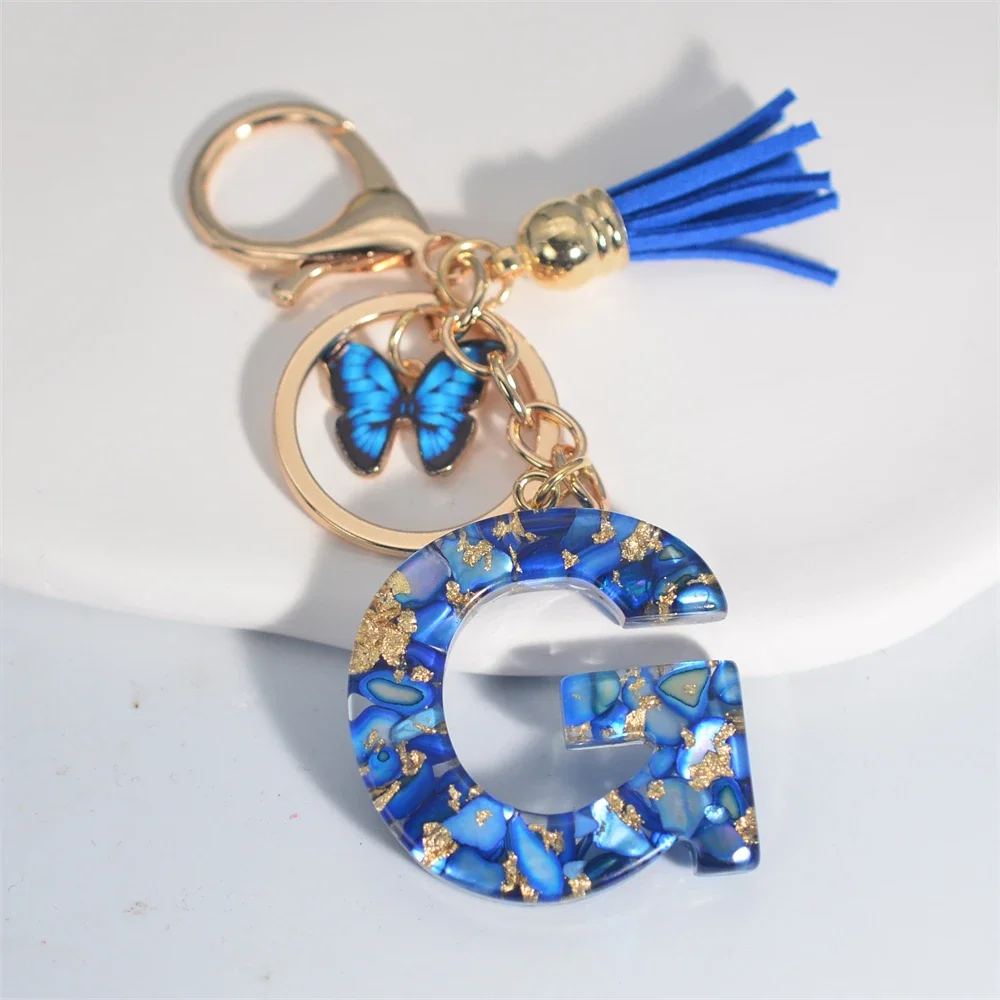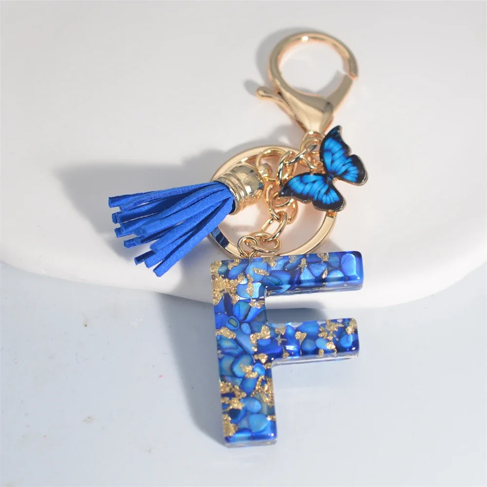 - This keychain features a vivid blue resin letter “S” with embedded gold flakes, creating an elegant, textured look that stands out and adds decorative charm to any accessory.