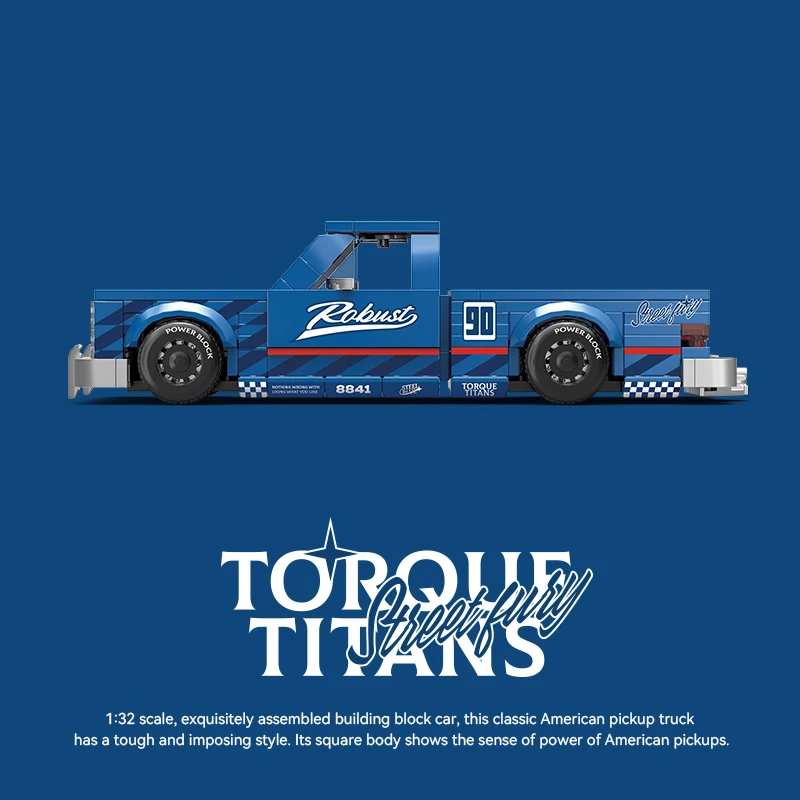 Immerse yourself in the nostalgic charm of this this blue retro puzzle block pickup truck. Crafted from interlocking ABS building blocks, it embodies a sturdy, pixelated aesthetic that captures the spirit of classic American trucks. The vibrant blue body is accented with white and red racing stripes, and the detailed chrome grille and silver bumper enhance its realistic appeal. The transparent windshield reveals a simplified interior cab, while the cartoonish graphic on the hood adds playful detail. The side doors elegantly display the word “Robust” in stylized cursive, complemented by the prominent “90” on the rear side panel, emphasizing a sporty theme. With rugged black tires and flared wheel wells, this toy balances durability with fun. The open truck bed features ridged detailing, perfect for display or collection. This product offers a blend of durability, style, and nostalgic playfulness, perfect for collectors and gift-givers alike.