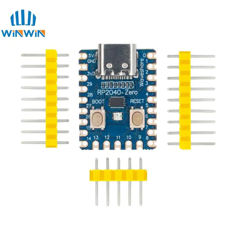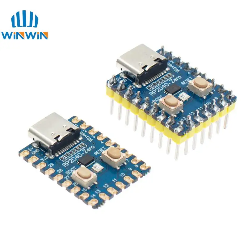 Experience the power and versatility of this sleek blue RP2040-Zero microcontroller board, designed with precision and care. Its vibrant blue PCB features smooth, rounded corners that give it a modern, polished look. The finely detailed white silkscreen markings highlight labels, pin numbers, and identifiers, emphasizing its organized and professional layout. The black microcontroller chip serves as a focal point, exuding minimalistic sophistication. Bright yellow plastic spacers on the metal pin headers add striking contrast, enhancing visual appeal. This compact development module offers excellent functionality and ease of integration, making it ideal for innovative projects. Imagine yourself using this device to build complex circuits effortlessly—reliable, stylish, and ready to power your creations.