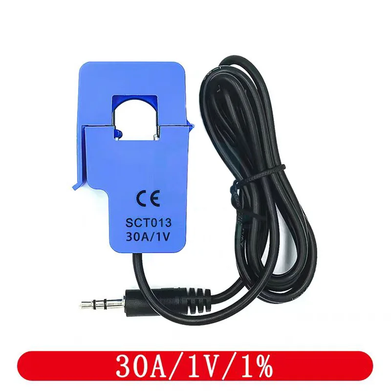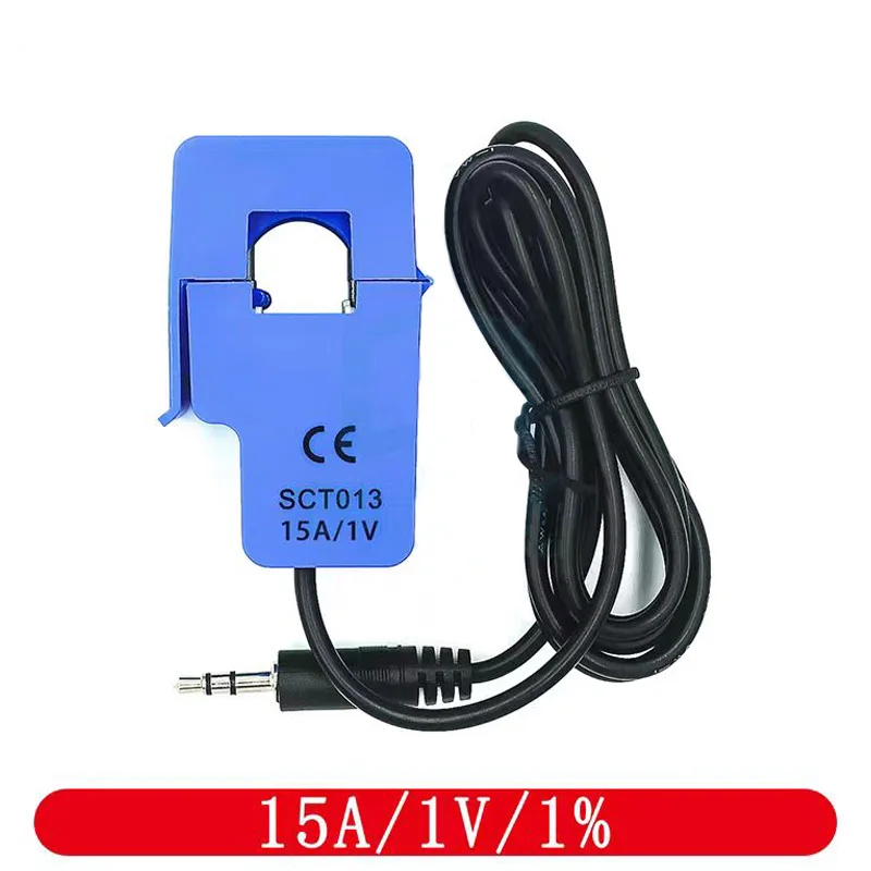 The SCT-013-000 is a sleek, blue, non-invasive split-core AC current transformer designed for accurate current measurement and monitoring. Featuring a compact 13mm x 13mm open slot, it easily clips onto conductors without disconnection, with a durable ferrite core rated for over 1000 open-close cycles. It offers rated input currents of 10A, 15A, 20A, 30A, 50A, 60A, and 100A, and operates at frequencies between 50Hz and 150kHz. Equipped with a 1.5-meter black cable ending in a Φ3.5mm mono jack, it provides both current and voltage outputs, with built-in sampling resistors for voltage measurement. Designed for safe, reliable use in monitoring AC motors, lighting, and air compressors, it maintains performance within ±3% non-linearity across 10–120% of rated current, with a safe insulation resistance of 6000V AC for 1 minute and an operating temperature range of -25°C to +70°C.