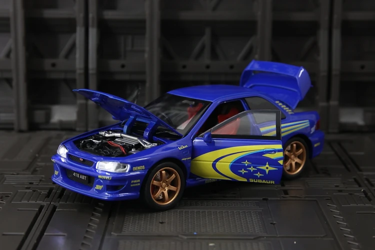 Experience the thrill of owning a highly detailed, miniature version of the iconic Subaru WRX STI in vibrant blue. Crafted with precision from durable metal, this 1:32 scale model captures the sleek, aerodynamic design of the real car, featuring smooth curves and a low profile that highlight its sporty essence. The openable doors, hood, and trunk reveal meticulously crafted interior and engine bay details, including a prominent scoop on the hood. Lighting effects and simulated sounds bring the model to life, making it a captivating centerpiece. Its realistic wheels, gold multi-spoke rims, textured tires, and red brake calipers enhance authenticity. This collector’s piece is perfect for display or as a gift for enthusiasts who appreciate high-tech, detailed craftsmanship.